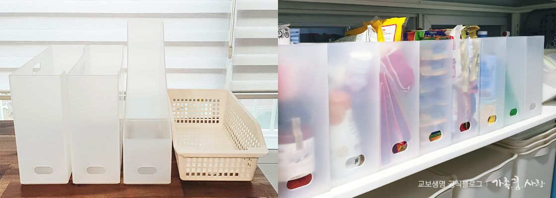 팬트리는 식료품을 저장하기도 하지만 세제 같은 것들도 보관하기 때문에 정리 정돈이 꼭 필요한공간입니다. 팬트리 공간은 선반형태로 꾸며져 있는 경우가 많아 무턱대고 물건을 쌓다보면 나중에 무엇이 있는지 찾기 힘들게 됩니다. 선반 공간은 꽤 넓기 때문에 물건을 한 눈에 파악할 수 있도록 투명 수납함을 쓰는 것이 좋습니다. 라면, 통조림, 각종 면, 소스 등을 담아 팬트리 공간을 정리하면 찾기도 쉽고, 남아 있는 수량을 파악해 필요한 것들 것 보충하기에도 편리하지요. 투명 수납함 대신 라벨지를 붙이는 방법도 있는데 라벨지는 생각보다 잘 떨어지고 생필품이 늘어나거나 바뀌는 경우가 많아 투명 수납함을 쓰는 게 더 효율적입니다.