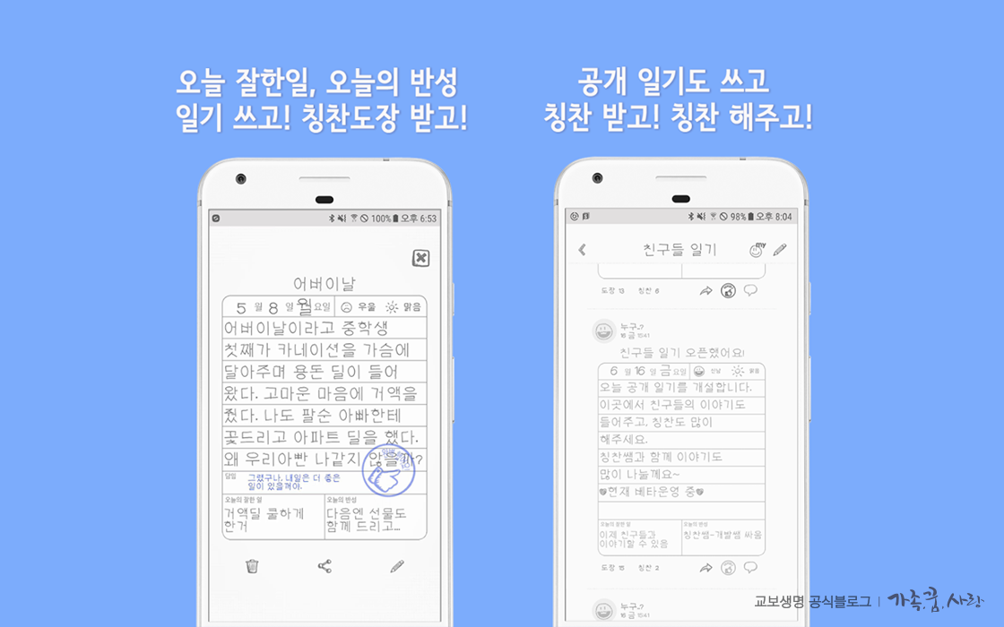 특히 원한다면 다른 사람들에게 일기를 공개할 수도 있어 서로의 일기를 칭찬하고 칭찬받기도 할수 있습니다. 일기 구독도 가능하고, 모임도 가능한 재미있는 일기앱 ‘칭찬일기장’입니다.