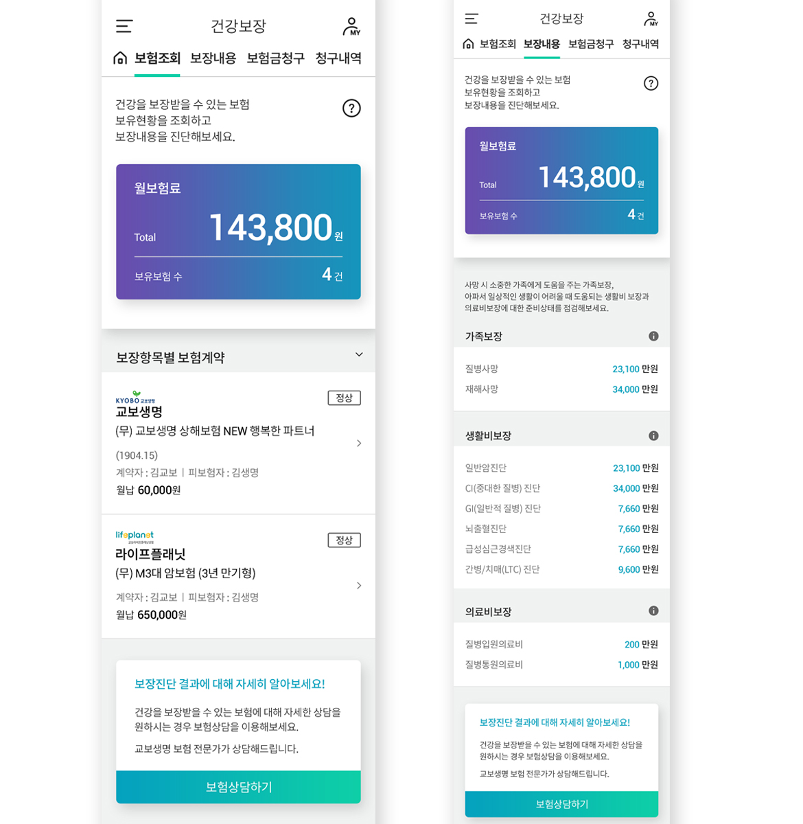 보험 생활에 필수적인 ‘보장 점검’ 역시 인슈어테크로 간편하게 누릴 수 있다. 한국신용정보원과 구축한 데이터 네트워크를 기반으로 우리 회사는 물론 타 보험사에 가입한 보장 내용까지 한번에 조회할 수 있다.
