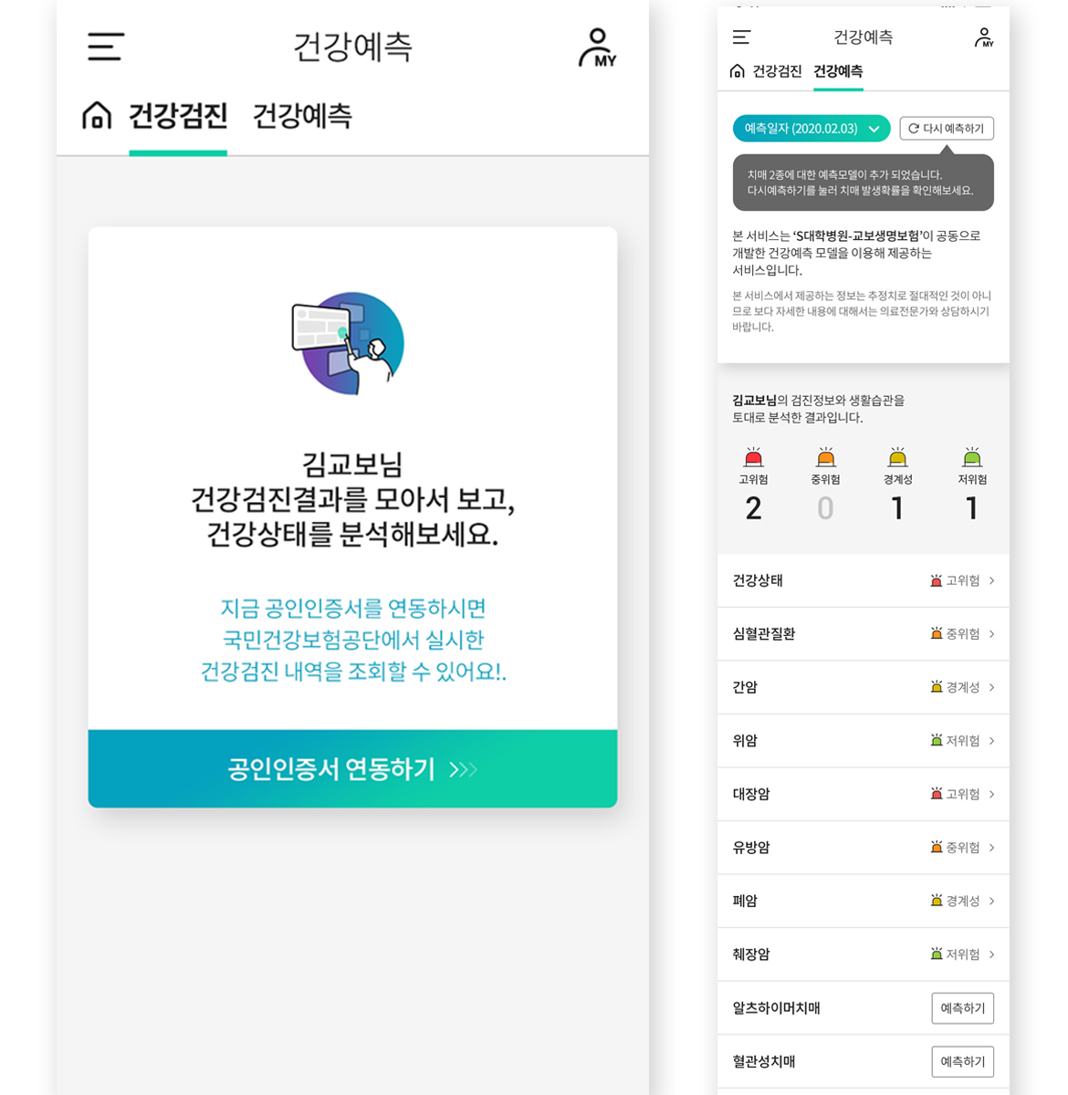 ‘Kare’의 건강예측 서비스는 교보생명이 국내 손 꼽히는 대학병원 의료진과 공동 개발한 서비스다. 국민건강보험공단과 교보생명헬스케어센터 기록에 남아있는 건강검진 데이터를 불러와 이를 바탕으로 빅데이터 기반의 건강예측 알고리즘을 가동한다.