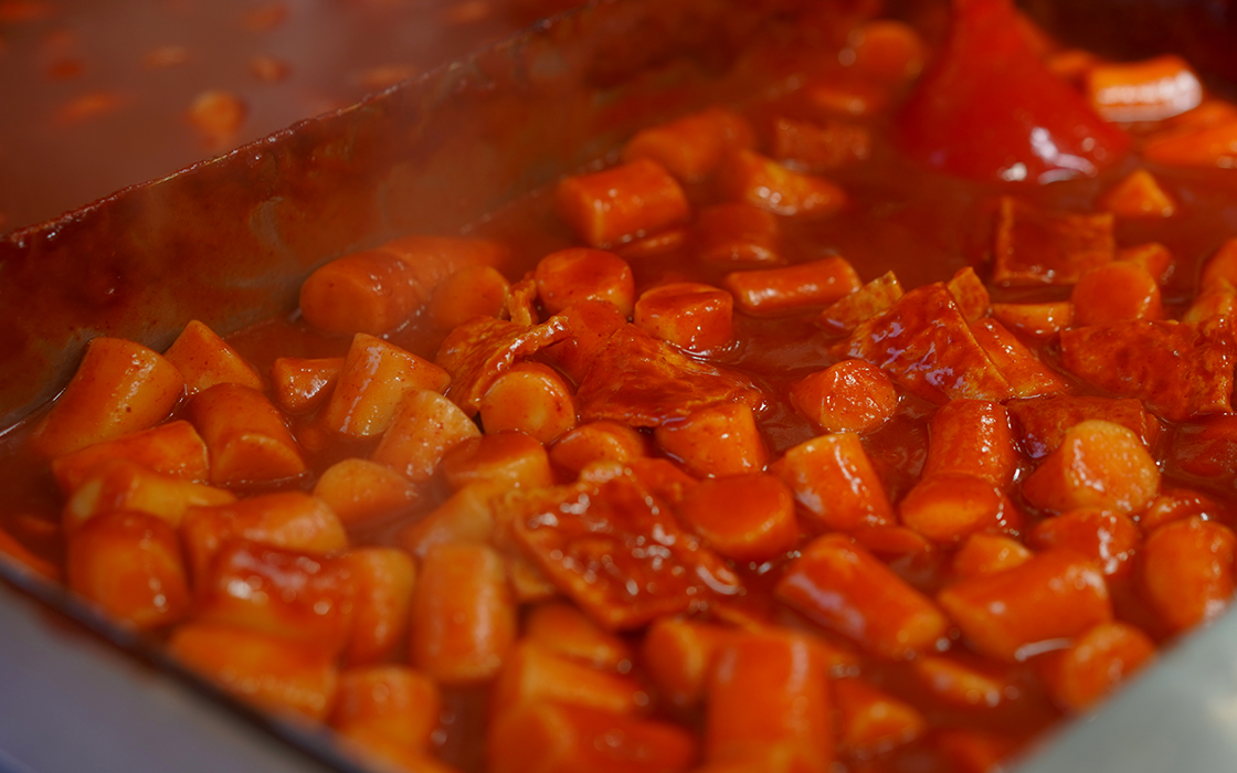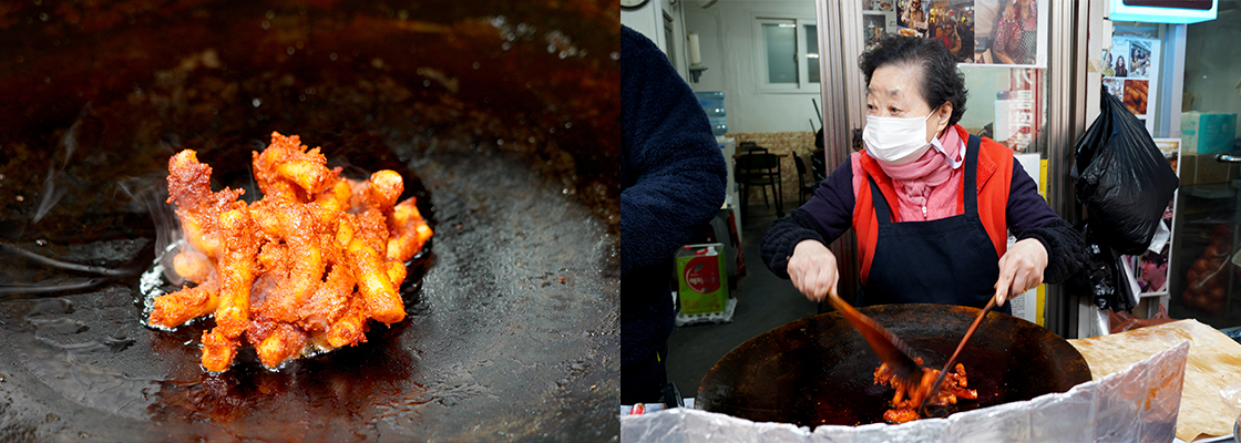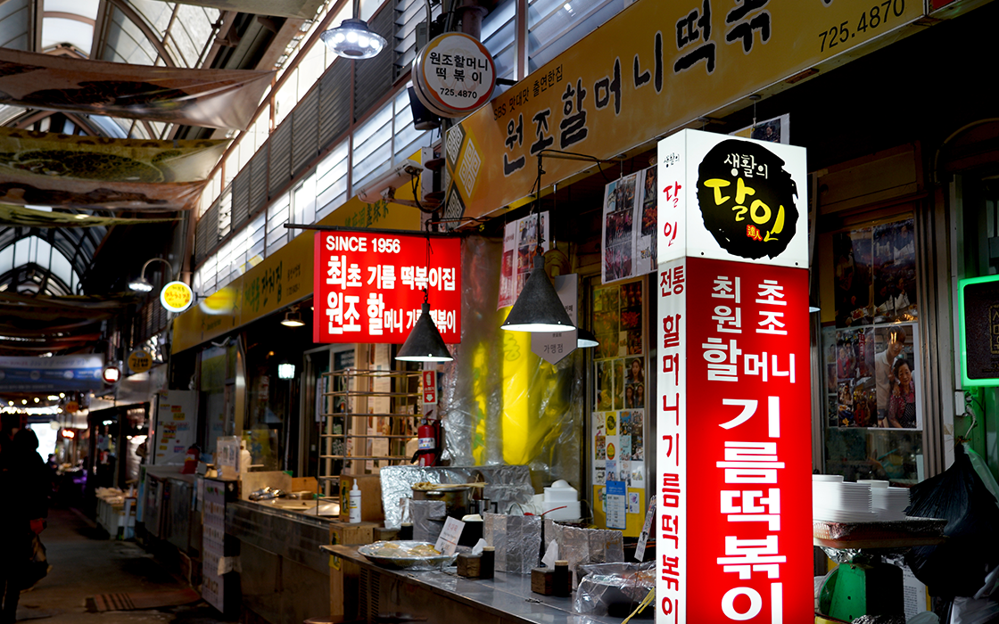 요즘은 뷔페나 배달상품에도 기름 떡볶이가 있는데요. 이 기름 떡볶이의 원조 격인 통인시장에 있습니다. 1956년부터 이 자리에서 기름 떡볶이를 시작한 ‘최초 원고’ 할머니 기름 떡볶이입니다. 기름 떡볶이는 이름 그대로 국물 없이 기름에 볶아낸 떡볶이입니다