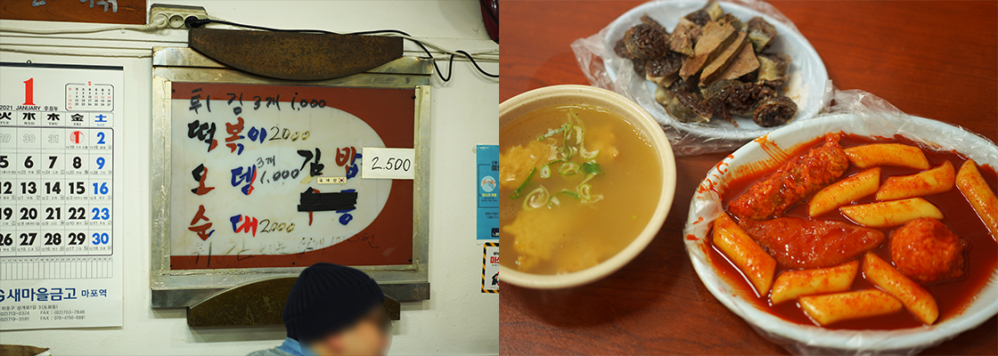 마포 원조 떡볶이집이 놀라운 것은 맛도 맛이지만 이 레트로한 가격입니다. 떡볶이 1인분에 2,000원, 튀김 3개 1,000원, 순대 1인분 2,000원 시롸? 김밥 빼고 다 시켰는데 6,000원입니다. 가성비를 넘어 갓성비!