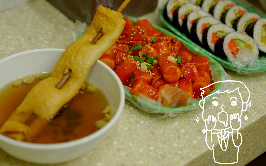 허름한 외관부터 맛집 포스가 줄줄~ 분식집답게 떡볶이, 어묵, 튀김, 순대가 가판에 순서대로 나열돼 있습니다. 특히 교식이 눈을 사로잡은 1열 종대로 줄 서 있는 가지런한 떡대들~ 마치 거대한 떡꼬치가 누워 있는 것 같은데요. 너무 가지런히 모여 있어서 그런지 침샘을 자극하진 않았…지만! 떡볶이 1인분과 매운 어묵 주문~ (떡볶이는 가판에서 서서 먹을 수도 있고 안쪽 홀에서도 먹을 수 있어요! )