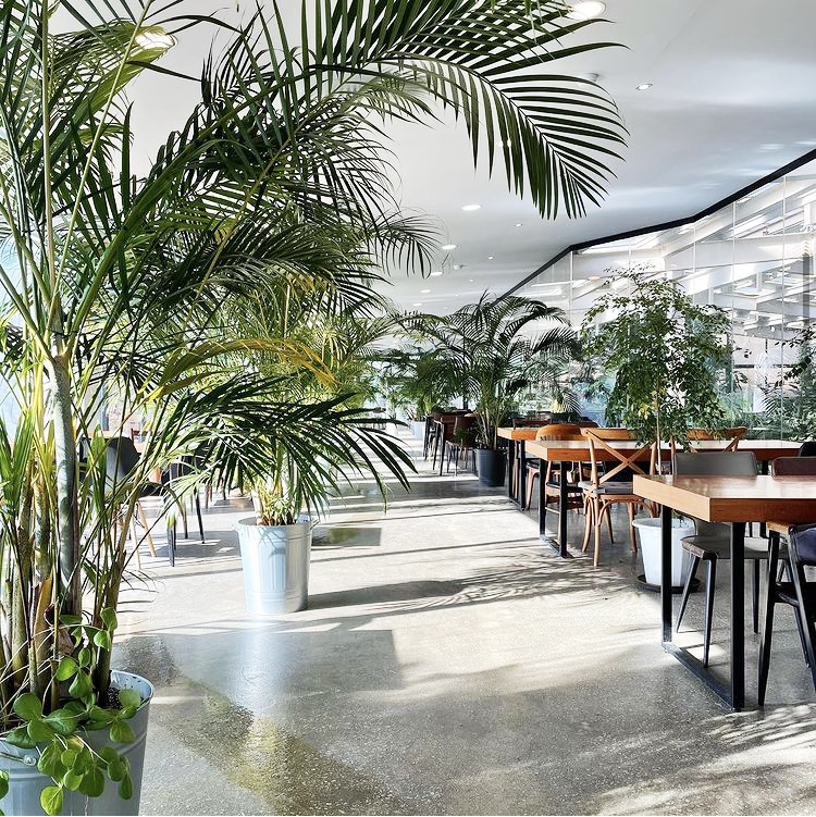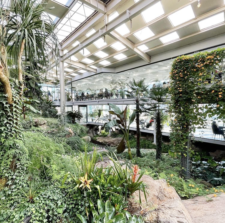 오랑주리 카페에 들어서면 마치 열대 우림에 온 것 같은 착각이 든다. 3층 규모의 대형 온실 구조 안에 홍콩 야자, 종려 야자, 알로카시아, 몬스테라 등 아열대 나무와 식물이 가득해 이국적인 풍광이 매력적이다.