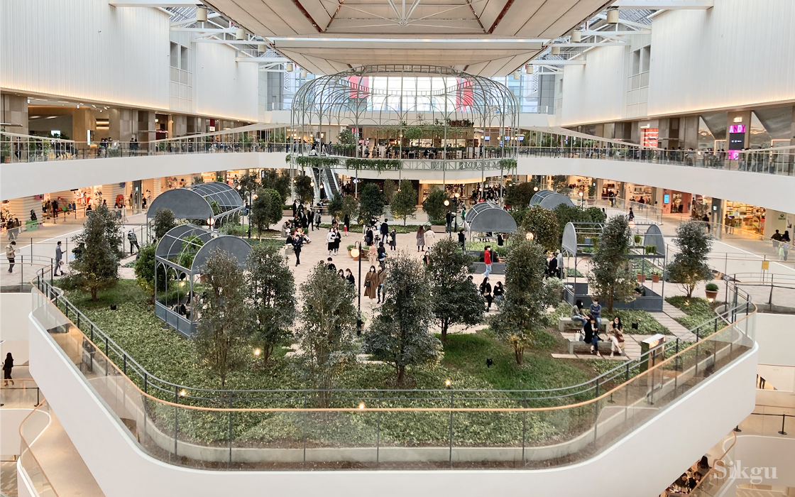 그중 5층에 꾸며진 실내 녹색공원 ‘사운즈 포레스트’는 더 현대 서울의 시그니처! 3,300㎡(1,000평)에 달하는 공간에 천연 잔디와 실제 나무와 꽃이 있어 식물이 주는 온화한 기운을 가득 느끼며 산책할 수 있다. 사운즈 포레스트에서는 들리는 음악은 날씨나 상황에 따라 큐레이션 돼 실내에서 느끼는 자연을 더 특별하게 감상할 수 있다.