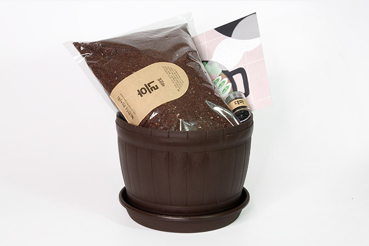 키트구성 | 화분, 화분 받침, 마사토, 배양토, 씨드볼(깃발 포함), 영양액비, 목초액, 피규어