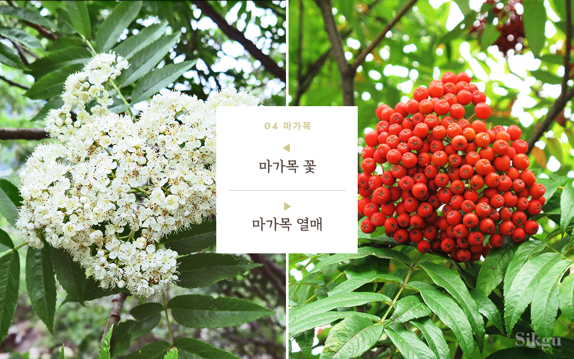 마가목은 흰 꽃과 붉은 열매가 아름다워 가로수나 공원의 조경수로 많이 심어져서 요즘 도심에서 많이 볼 수 있다. 겨울눈의 생김새가 말의 긴 이빨 모양을 닮았다 하여 마가목이라 이름 지어졌다. 붉은 열매는 겨울을 나는 새들에게는 아주 귀한 식량이 되기도 하지만 열매만큼이나 발갛게 물드는 잎은 가을을 화려하게 물들인다.