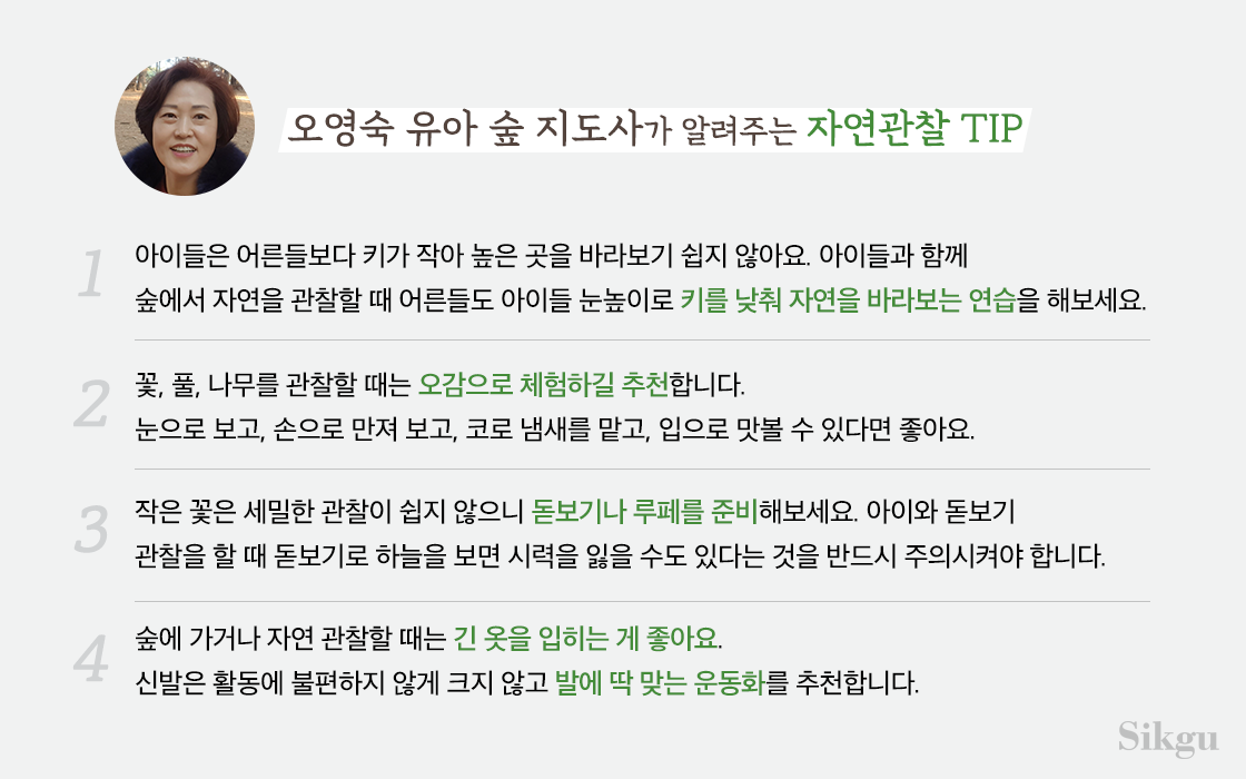 “숲은 아이들에게 자연의 섭리와 생태를 통해 안정적인 정서를 주는 아주 훌륭한 스승입니다. 자연을 관찰하고 탐색하는 것은 아이들에게 모두 공부이고 즐거운 놀이죠. 가까운 숲길이나 공원, 식물원, 길을 걸으면서 주변에 있는 자연을 관찰하며 새로운 경험과 즐거운 시간을 가져 보시길 바랍니다.”