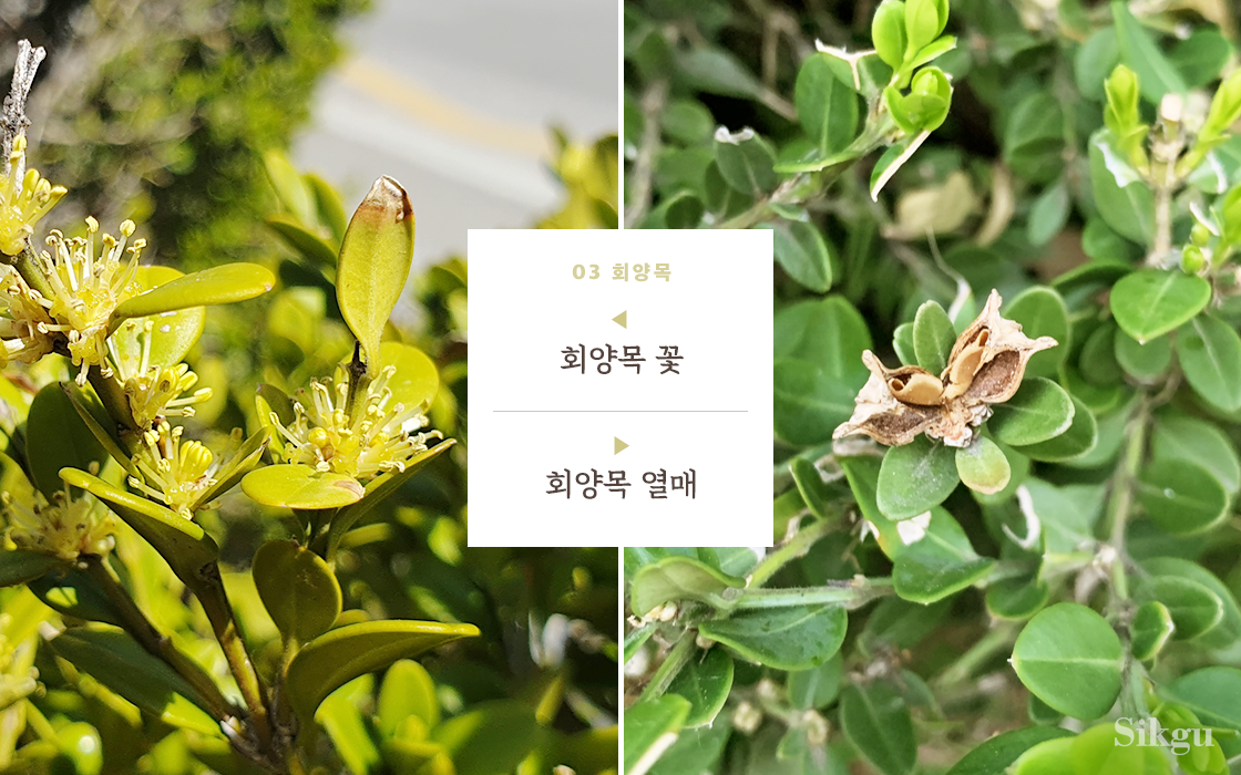 회양목 관찰 TIP) 회양목꽃은 암술과 수술만 보이고 꽃잎이 없어요. 회양목꽃 관찰 후 아이와 꽃잎이 없는 꽃에 대해 함께 공부해보세요. 가을이면 열매도 열리는데 뿔이 세 개 달린 열매가 익어서 벌어지면 꼭 부엉이를 닮았답니다. 가을이 되면 집 주변 울타리에 심어진 회양목에서 부엉이를 찾아보면 재미있는 놀이가 돼요.