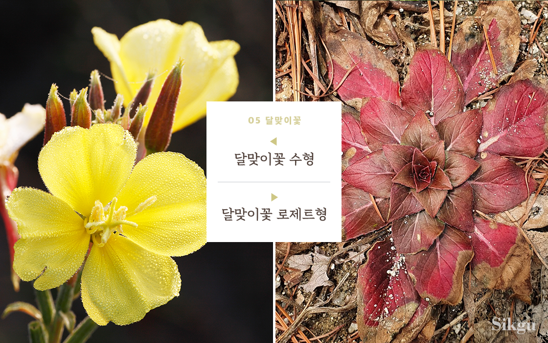 달맞이꽃은 여름에 피지만 봄에는 주변에서 쉽게 붉은 로제트형의 달맞이꽃을 찾아볼 수 있다. 로제트 식물들의 겨울 잎의 색들은 붉은색이 많다. 추위와 가뭄으로부터 식물을 보호하는 안토시아닌 색소 때문인데 봄이 되면 광합성 활동으로 입이 초록색으로 변하며 자란다. 로제트 식물이 잎을 넓게 펴고 땅에 달라붙어 있는 이유는 땅의 지열과 햇빛을 충분히 받기 위해 잎을 서로 겹치지 않고 최대한으로 넓히기 때문이다.