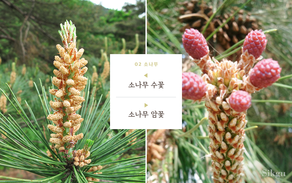 소나무의 꽃은 암꽃과 수꽃이 있는데 수꽃의 송화가루가 바람에 날려 암꽃에 수정되면 우리가 아는 솔방울이 된다. 암꽃과 수꽃 구분이 쉬워 아이와 육안으로 관찰하기 좋다.
