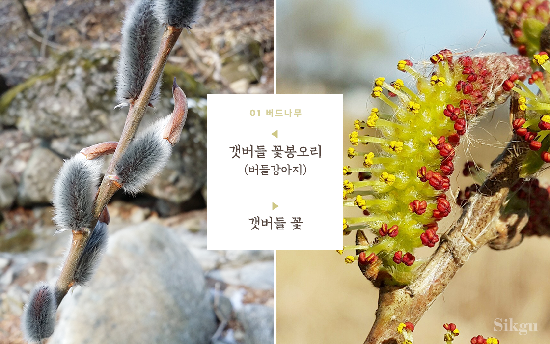 봄을 알리는 대표적인 버드나무는 우리나라에만 40여 종이 있다. 봄이 되면 버드나무의 겨울눈 껍질이 벗겨지고 부드러운 솜털을 잔뜩 단 꽃송이가 핀다. 갯버들의 꽃을 흔히 '버들강아지'라고 부르는데, 갓 태어난 어린 강아지의 부드러운 털을 연상시켜 이름 붙여졌다. 버들강아지가 활짝 피면 마치 송충이 벌레 같은 꽃이 핀다.