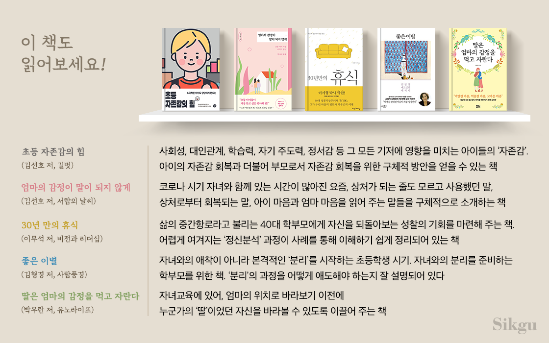 사회성, 대인관계, 학습력, 자기 주도력, 정서감 등 그 모든 기저에 영향을 미치는 아이들의 ‘자존감’. 아이의 자존감 회복과 더불어 부모로서 자존감 회복을 위한 구체적 방안을 얻을 수 있는 책