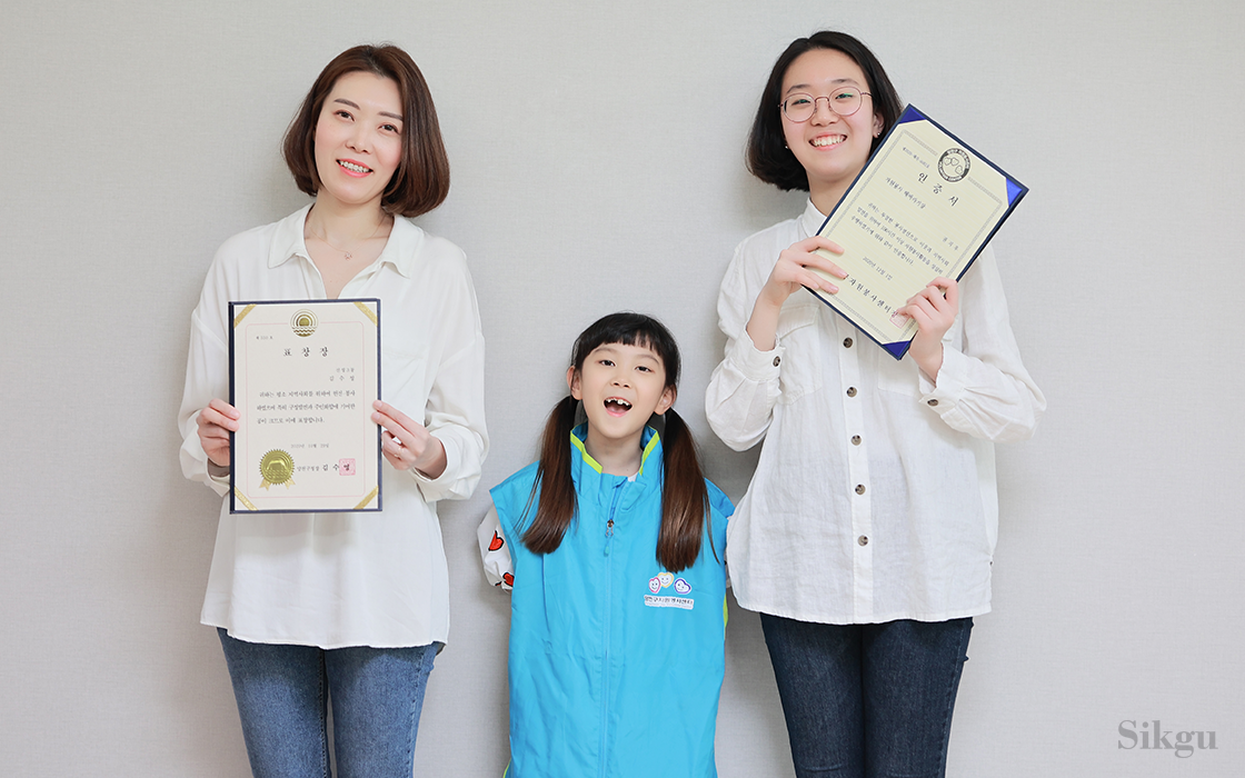언니 지후는 봉사 100시간 이상 수행자들에게 양천구청장이 수여하는 ‘해바라기장’도 받고, 가족 봉사활동 외에도 현재 청소년 봉사동아리 활동도 하고 있다. 아이가 성장하면서 가족 봉사활동이 준 영향이 점점 더 크게 느껴진다고.