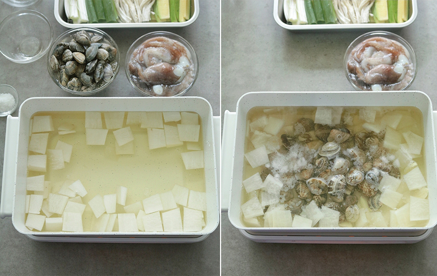 1. 멸치·다시마 육수 1L를 냄비에 붓고 나박 썬 무를 넣고 끓인 후 해감한 바지락, 편마늘, 소금 반 스푼을 넣는다.