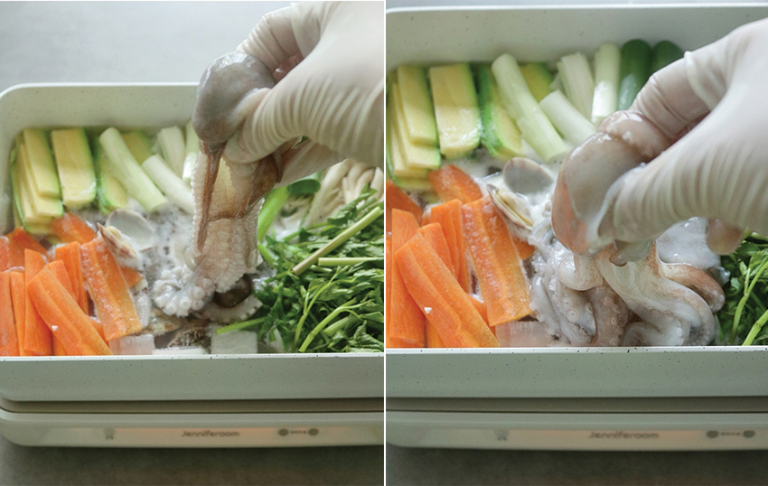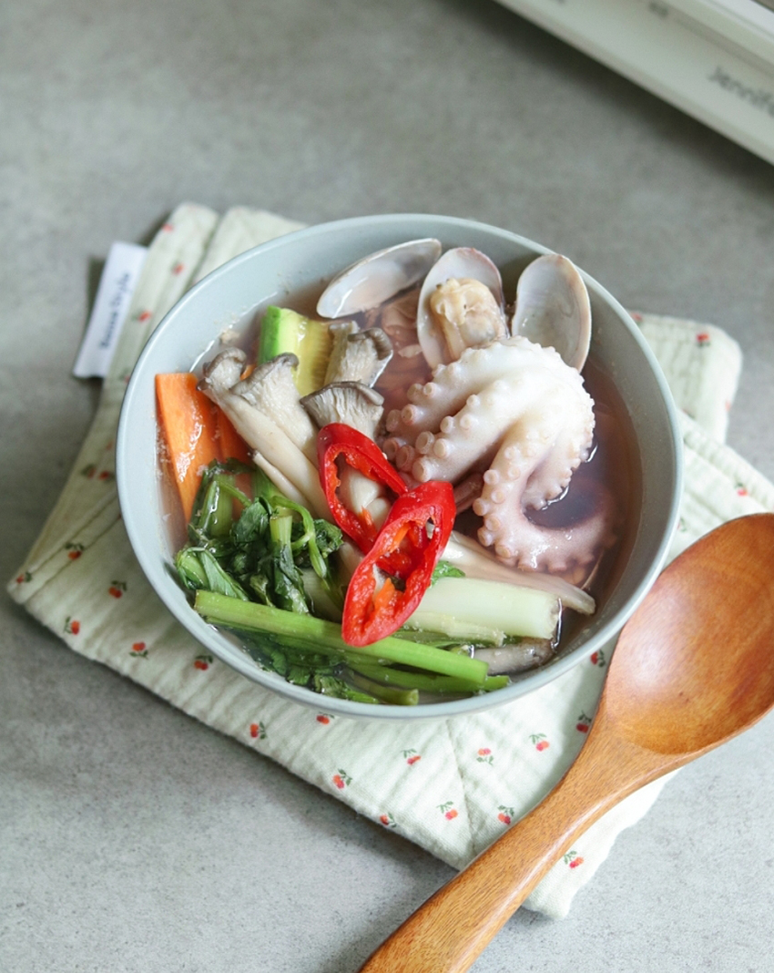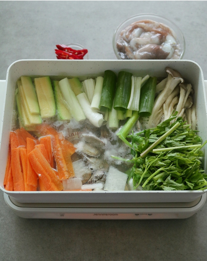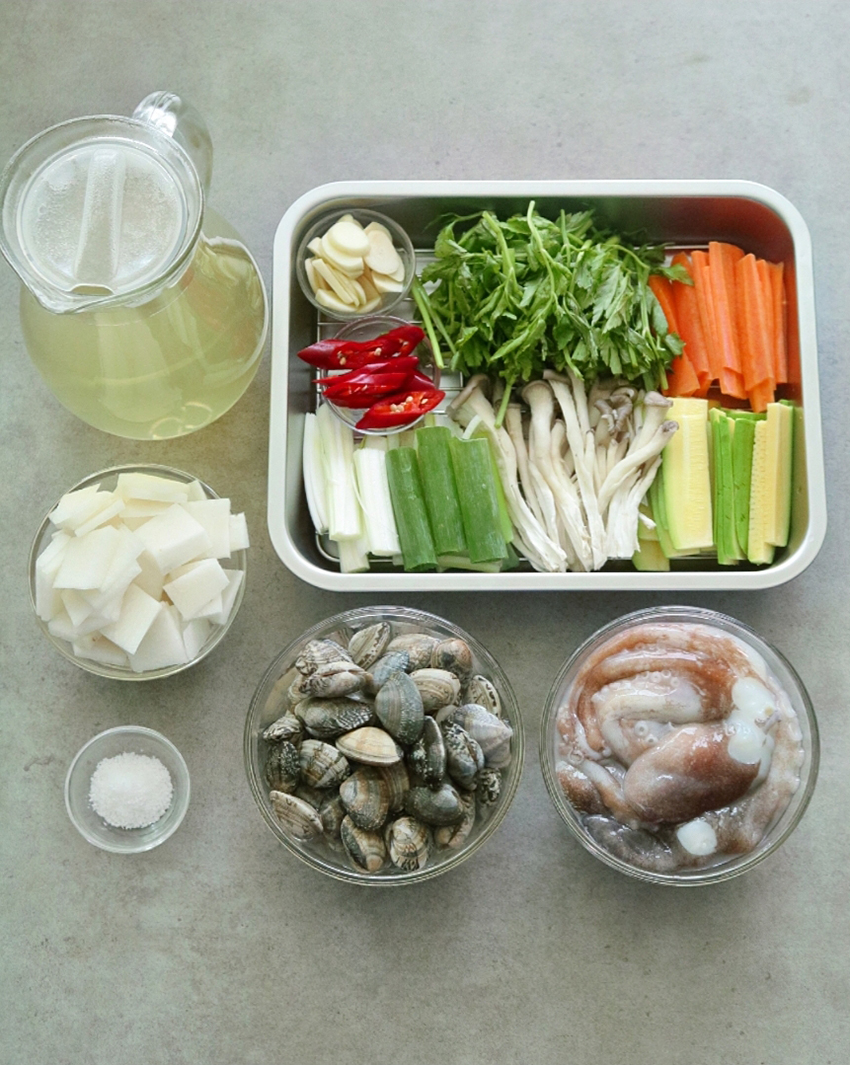 재료 : 낙지 3마리, 바지락 30~400g, 멸치·다시마 육수 1L, 무, 당근, 애호박, 대파, 느타리버섯(팽이버섯), 홍고추, 미나리 또는 쑥갓, 편마늘, 소금