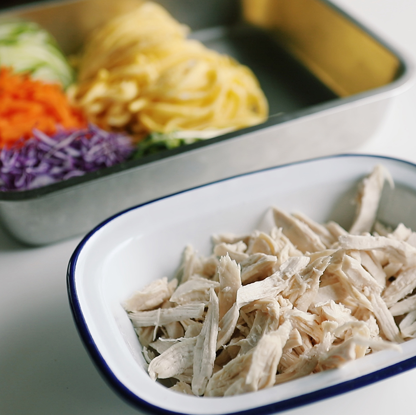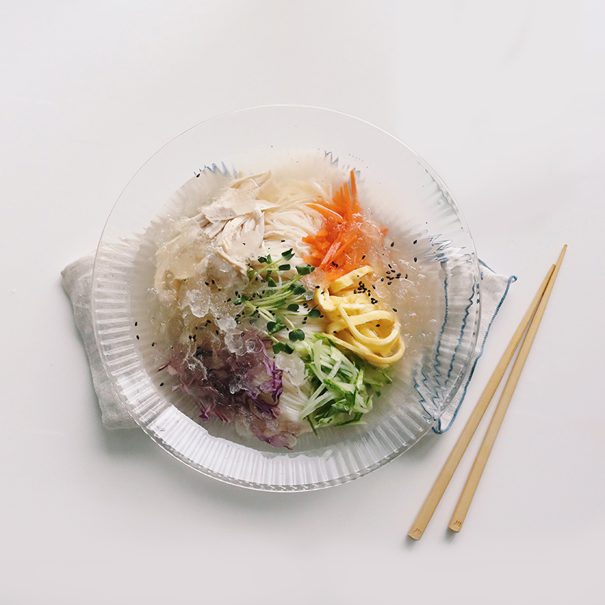 3. 넉넉한 그릇에 소면을 담고 채소 닭가슴살 올린 후 살얼음 육수를 부어준다.