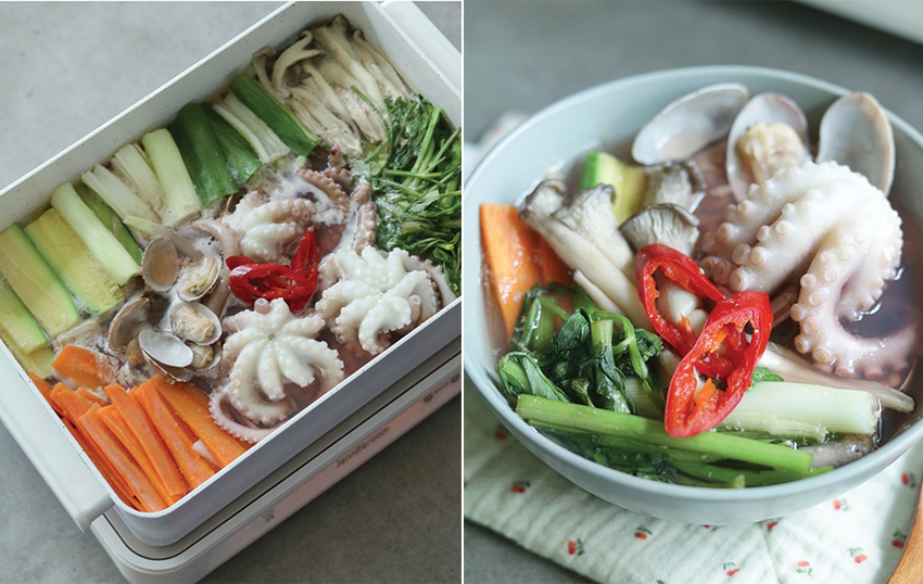 재료 : 낙지 3마리, 바지락 30~400g, 멸치·다시마 육수 1L, 무, 당근, 애호박, 대파, 느타리버섯(팽이버섯), 홍고추, 미나리 또는 쑥갓, 편마늘, 소금