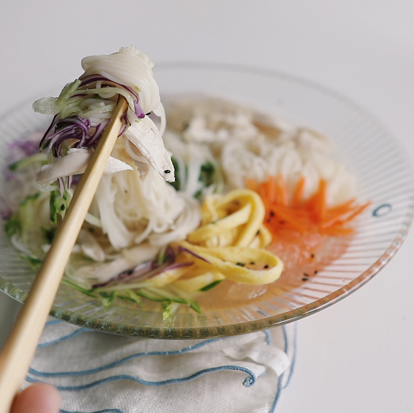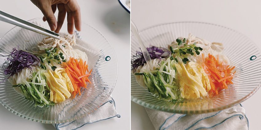 3. 넉넉한 그릇에 소면을 담고 채소 닭가슴살 올린 후 살얼음 육수를 부어준다.