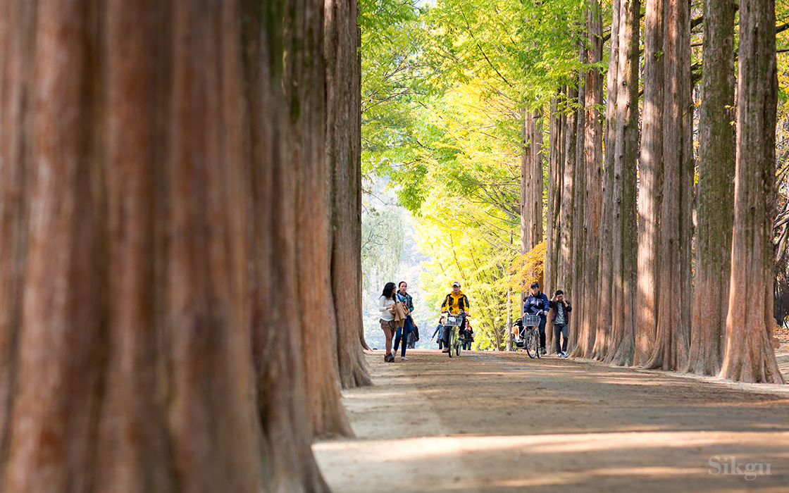 여전히 많은 볼거리와 즐길 거리로 사랑받고 있는 남이섬! 14만 평 규모의 남이섬을 제대로 둘러보기 위해서는 두 발보다는 바퀴가 효과적이다. 입구의 바이크 센터에서 싱글, 커플, 패밀리 등 가족 구성원에 맞는 자전거를 빌려 섬 한 바퀴를 돌아보며 가을의 정취를 느껴보면 어떨까? 남이섬 자전거 코스는 섬 외곽을 따라 크게 한 바퀴를 도는 코스를 추천한다. 자동차도 다닐 만큼 도로 정비가 잘 되어 있어 어린아이도 안전하게 자전거 투어가 가능하다. 레일을 따라 하늘을 달리는 하늘 자전거도 특히 아이들에게 인기다. 단, 코스가 짧기 때문에 유니세프 나눔 열차, 스토리 투어 버스 등을 같이 이용하는 게 좋다.