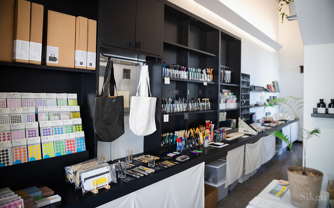 문단은 문구점이에요. 제가 문구류를 좋아하기도 하고 속초에 별로 없는 '낯선 공간'을 만들고 싶었어요. 그래서 창고처럼 쓰이던 문우당 건물 계단실을 활용해서 문구점을 열었죠. 계단이 만든 사선 천장과 건물 복도 마감을 그대로 살린 날 것의 분위기에 아주 세련되고 감각적인 문구류를 전시하듯 들여놓았더니 꽤 근사하더라고요.