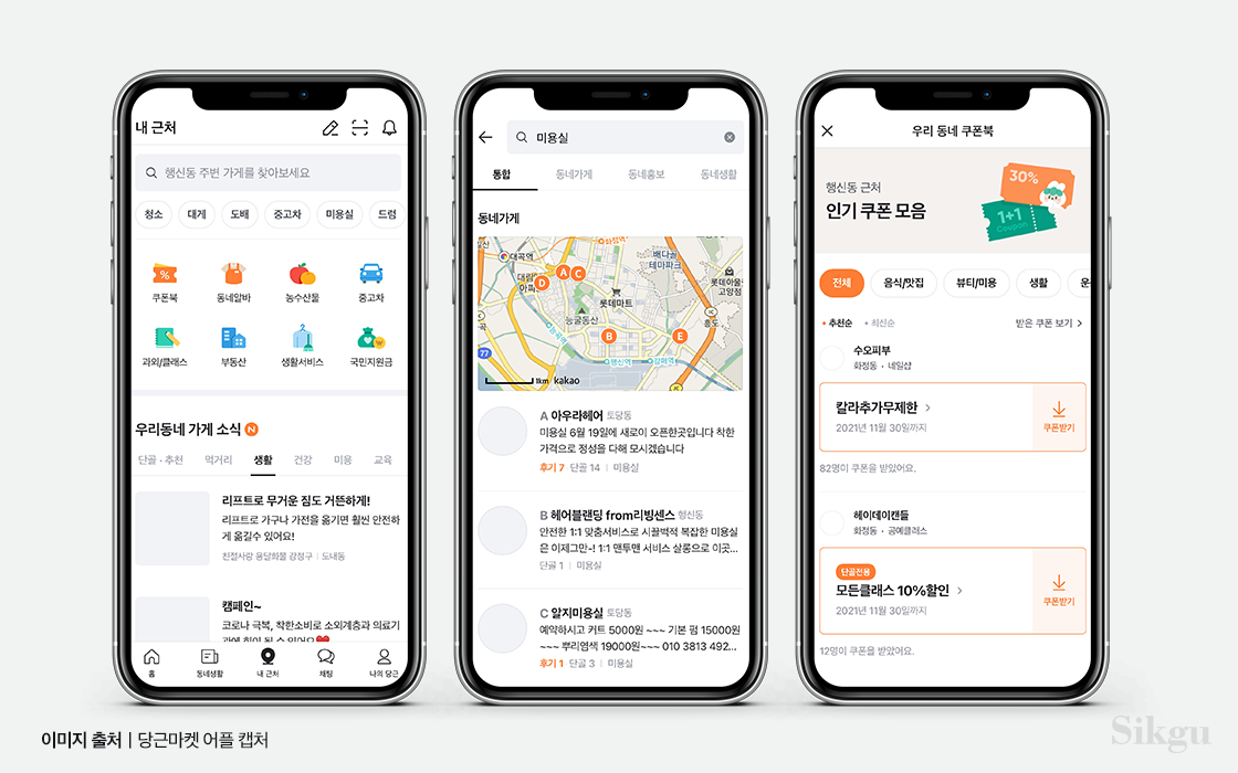 우리 동네 가게 소식을 한번에 보고 싶다면 '내 근처' 탭을 눌러보자. 먹거리, 생활, 건강 등 다양한 카테고리의 근처 가게를 한눈에 찾아볼 수 있다. 부동산, 중고차 등 덩치 큰 매물도 이곳에서 만날 수 있다. 가게에 방문하기 전 쿠폰 확인은 필수! 동네 알바도 당근마켓에서 찾을 수 있다. 명절, 크리스마스 시즌에는 괜찮은 단기알바 자리가 꽤 많다고 하니 참고할 것.