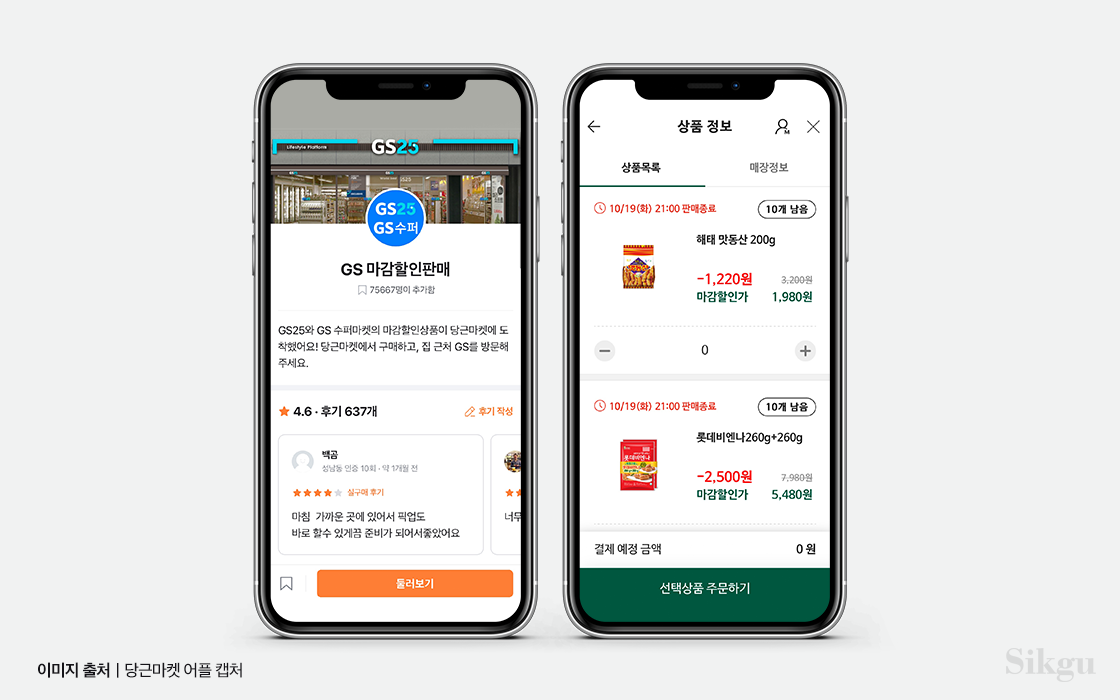 최근 당근마켓은 GS 수퍼마켓과 손을 잡고 ‘마감할인판매’ 서비스를 시작했다. GS 수퍼마켓에서 마감이 임박한 제품을 할인된 가격에 확인할 수 있는 것. 내 위치와 가까운 GS 수퍼마켓의 할인 제품을 장바구니에 담고 당근마켓에서 결제까지 마친 후 정해진 시간에 픽업하면 끝! 오늘 저녁 메뉴가 고민이라면 지금 바로 당근마켓에 GS마감할인판매를 검색해보자.