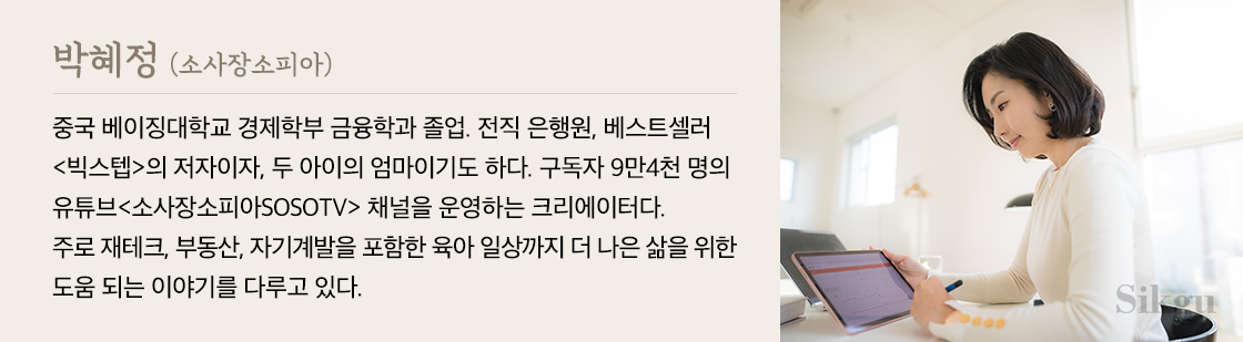 우리 아이가 성인이 될 사회는 지금과는 또 다른 모습일 거예요. 그래서 유행에 따른 투자상품이나 경제용어를 교육하는 것보다는 시대가 변해도 달라지지 않을 핵심 경제관을 심어주는 것이 가장 중요합니다. 자본주의 사회에서 돈은 어떤 의미이고, 돈에 대해 어떤 가치관을 갖고 살아가야 하는지, 의미 있는 삶이 무엇인지 같은 것들이요. 아이들과 함께 생각하시면서 대화를 많이 나누셨으면 해요. 저도 그런 부모가 되기 위해 노력 중입니다.