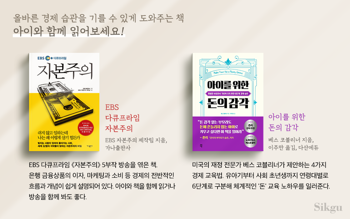 EBS 다큐프라임 《자본주의》 5부작 방송을 엮은 책. 은행 금융상품의 이자, 마케팅과 소비 등 경제의 전반적인 흐름과 개념이 쉽게 설명되어 있다. 아이와 책을 함께 읽어나 방송을 함께 봐도 좋다.