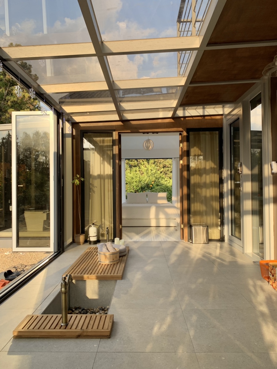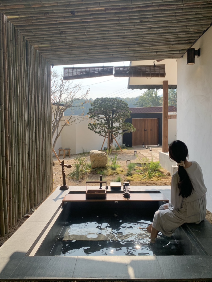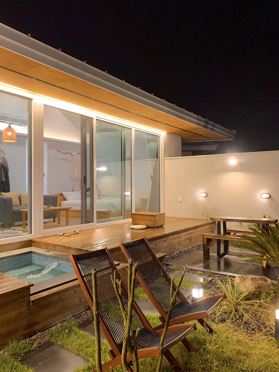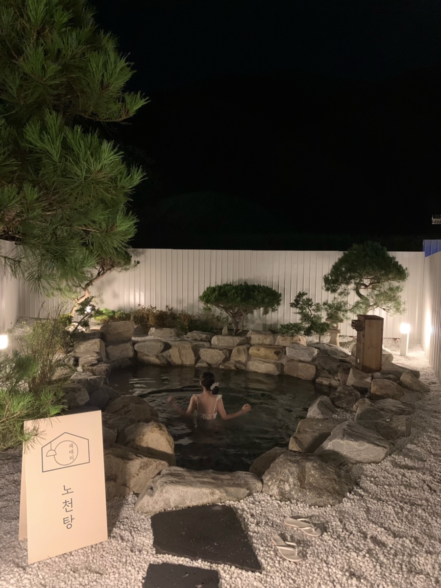 노천탕 펜션 산온스테이. 잘 다듬어진 마당과 기와, 툇마루 등 한옥 조경이 아름다운 펜션이다. 이곳 역시 실외 노천탕과 실내 자쿠지가 하나씩 있다. 해가 지면 은은한 조명이 마당을 감싸고, 한 켠에 마련된 노천탕에서 음료를 홀짝이면서 반신욕을 즐기면 이보다 행복할 수가 없다. 끝나고 바비큐 타임 역시 필수.
