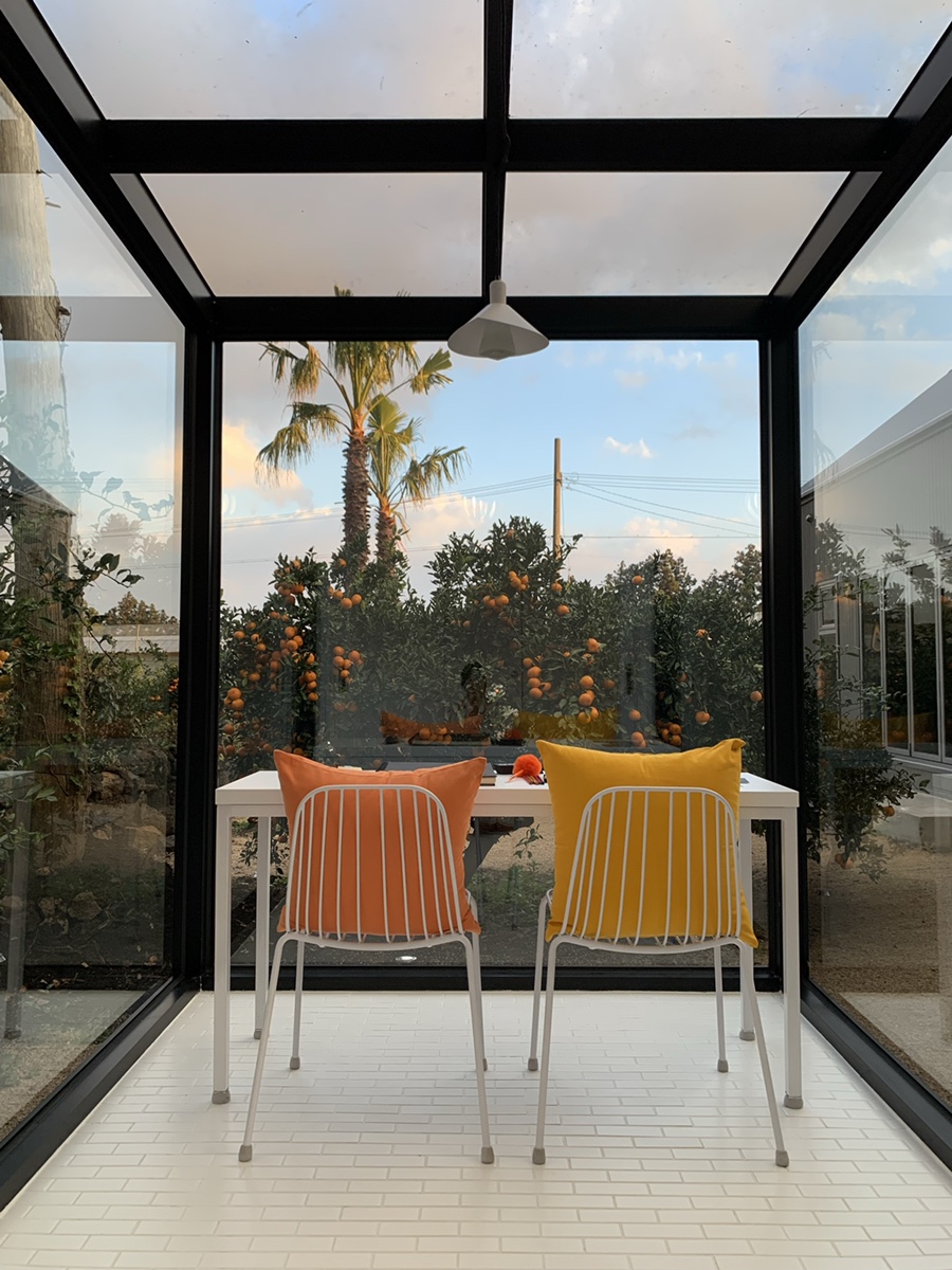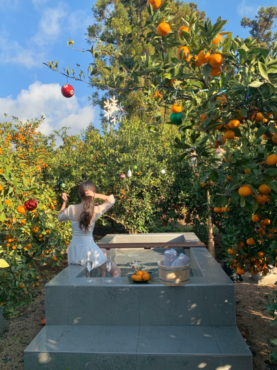 제주 독채 펜션 귤림동화. 겨울 제철 과일인 귤 따기 체험도 가능하다. 귤 밭 한가운데 실외 자쿠지가 있어 이색적이고, 실내에도 욕조가 있어 족욕을 할 수 있다. 부엌부터 침실, 샤워실, 테라스까지는 모두 통창으로 되어 있어 뷰 맛집. 침대 밑에는 레일이 깔려 있어 쭉 밀면 침대가 그대로 귤밭으로 이동하는 이색적인 경험을 할 수 있다.