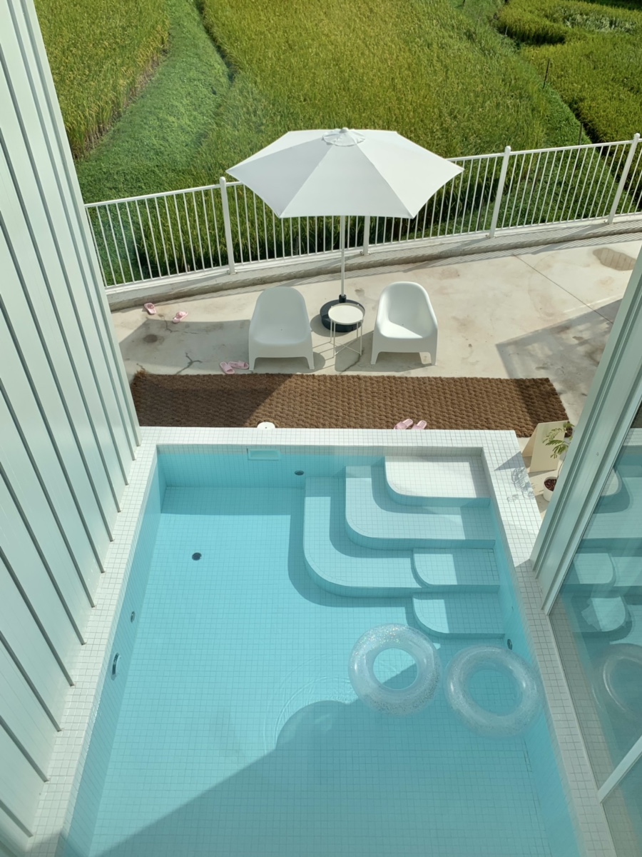 경주 풀빌라 독채 펜션 래태리. 휴양지 감성의 야외 풀장과 아늑한 프라이빗 노천탕이 있는 펜션이다. 돌담으로 둘러싸인 노천탕에 몸을 담그면 일본 온천 여행지로 소환된 듯한 느낌을 받을 수 있다. 숙소 내부는 화이트톤으로 매우 깔끔. 숙박객들을 위한 간의 편의점과 바비큐장, 세탁기, 식기세척기까지 갖춰져 있어 굉장히 편리하다.