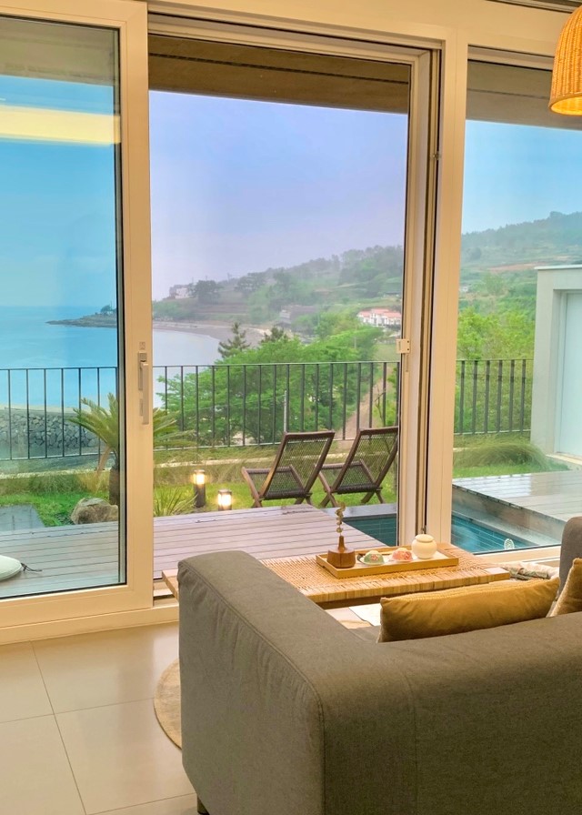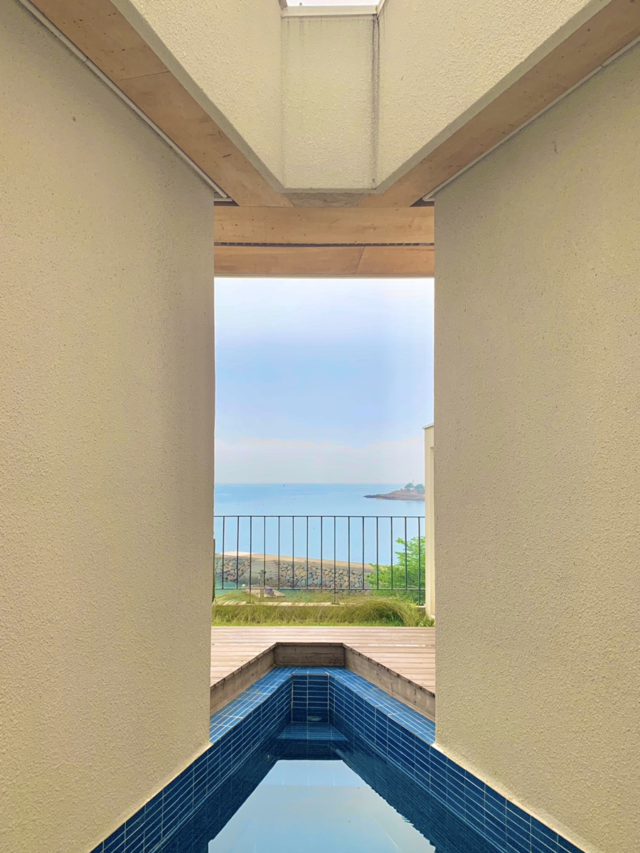 남해 오션뷰 감성 숙소 적정온도. 야외 노천탕과 개별 수영장, 개별 마당이 있는 귀여운 펜션이다. 테라스에서는 뻥 뚫린 남해가 보여서 해돋이도 볼 수 있다. 놓치지 말아야 할 포토스팟도 있는데, 바로 수영장과 테라스 사이 삼각형 공간이다. 어떻게 찍어도 인생샷이 나온다고 하니 꼭 사진을 건져보자.