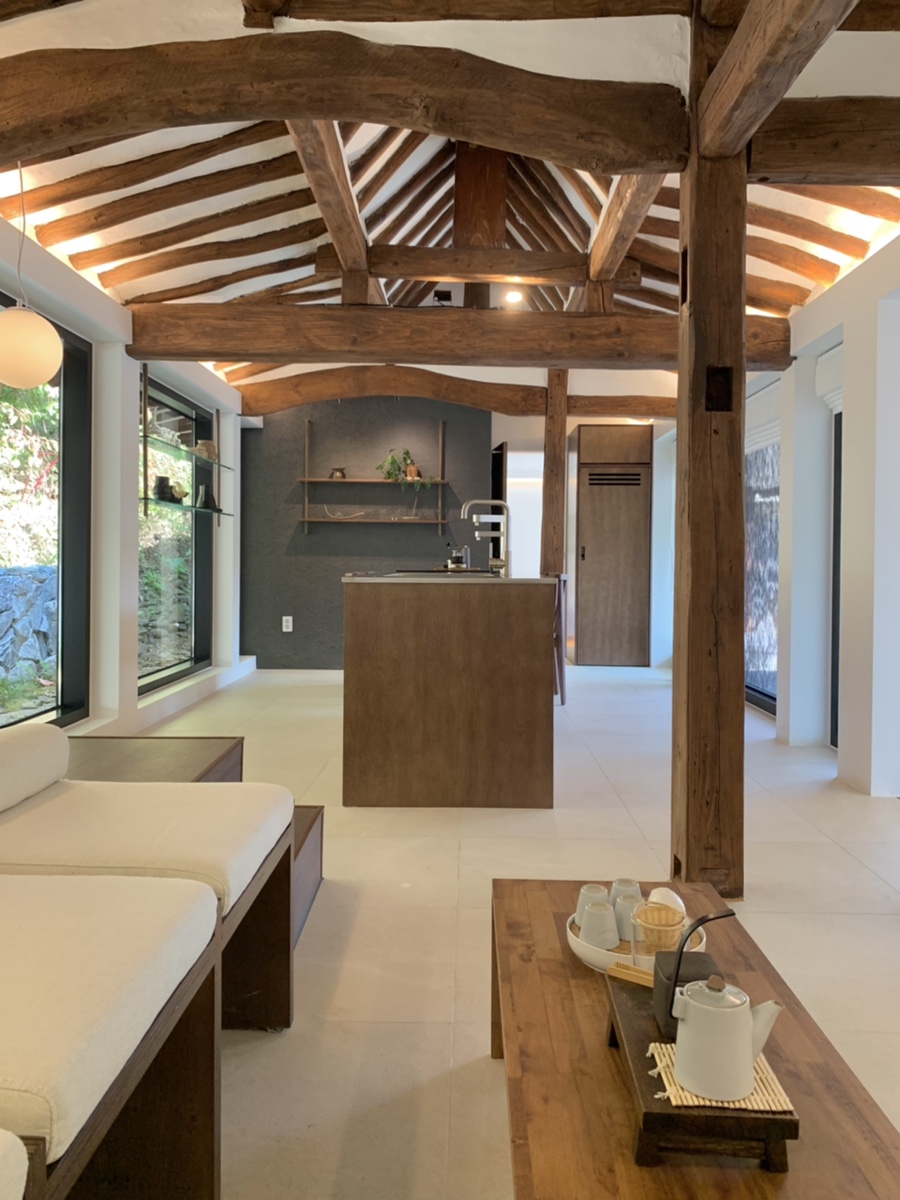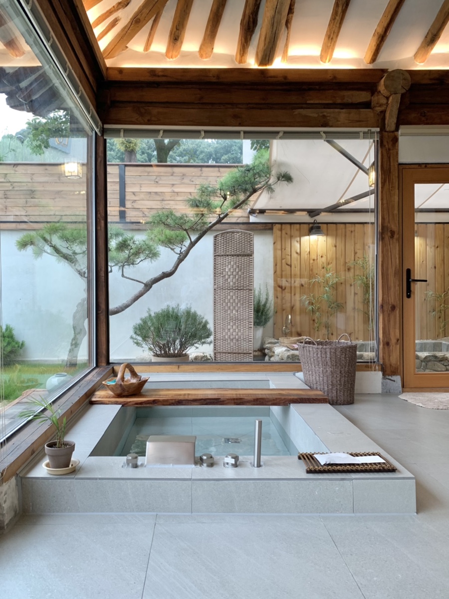 전주 한옥 펜션 다가도원. 퓨전 한옥 인테리어가 돋보이는 숙소다. 넓은 마당 한쪽에는 야외 노천탕이, 통창으로 된 공간에는 실내 자쿠지가 있다. 플로팅 트레이에 식혜와 구운 달걀을 넣어 동동 띄우고, 표주박으로 몸에 따뜻한 물을 뿌려가며 반신욕을 즐기다 보면 시간 가는 줄 모른다.