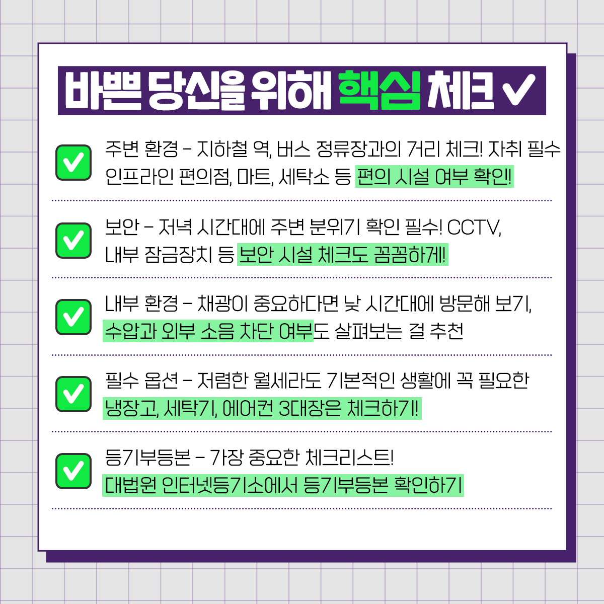먼저, 이 집이 나에게 정말 살기 좋은 집이다! 알아보려면 주변 환경부터 잘 살펴봐야 해 지하철이나 버스를 이용해 매일 출퇴근을 해야 한다면? 집에서 지하철역, 버스정류장까지 거리가 얼마나 되는지 정확히 알아보는 게 중요해. 출퇴근 등의 이동시간을 줄이려고 이사하는데, 분명 역세권이라고 했지만 걸어서 15분 이상 걸린다면 다시 고민해 봐야겠지? 그리고 자취할 때 필수! 편의점은 가까이에 있는지. 마트, 세탁소 등 자주 이용하는 편의시설이 집 근처에 있는지 확인해야 해. 그렇지만 만약 소음에 민감하다면 집 주변에 고깃집, 호프집같이 술을 먹는 손님들이 많은 곳은 피하는 게 좋아.🙅♂️ 큰 대로변에 바로 위치한 집이라면 자동차, 오토바이 지나다니는 소음으로 불편할 수 있으니까 꼭 참고하길 바래!