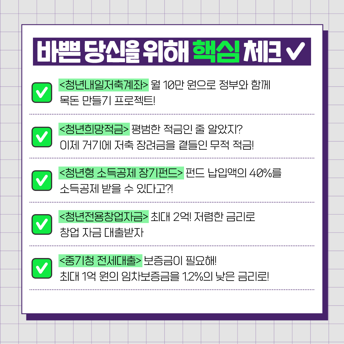 -! 친구들아 반가워! 2022년이 시작되고 시간이 훌쩍 흘러 어느덧 2월이다!🤩 친구들의 요즘 최대 고민은 어떤 거야? 코로나는 여전히 가라앉을 기미가 보이지 않고, 취업도 어려운데 내 집 마련은 더 어렵게 느껴지는 요즘이지. 친구들과 같은 청년들이 어려움을 극복🔥할 수 있도록 정부에서 지원받을 수 있는 똑똑한 정책들을 소개할게! 알아두면 돈이 되는 쏠쏠한 청년 정책은 어떤 것이 있을까? 올해 친구들이 지원받을 수 있는 정책들을 한 번 알아보자!