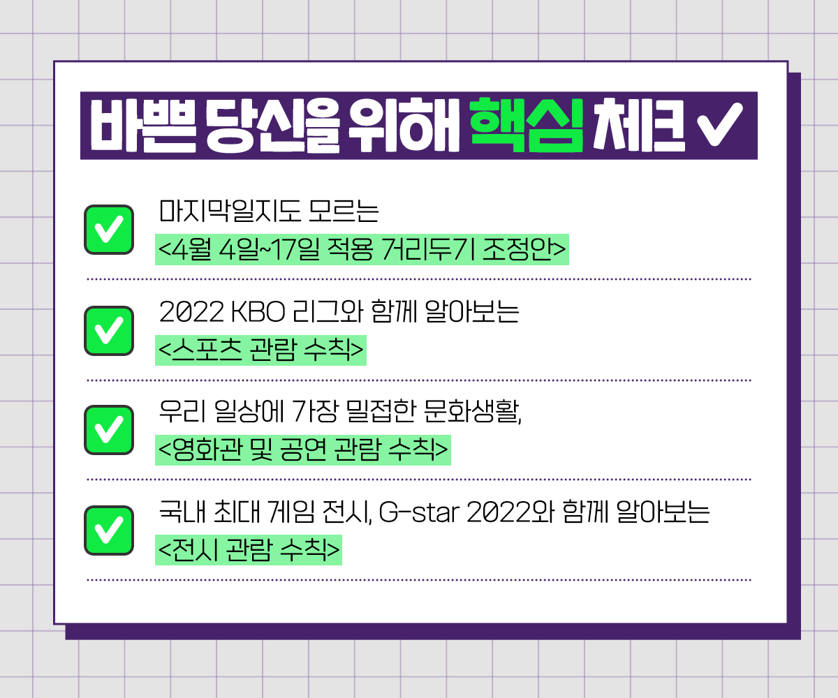 교하-!👋 코로나 대유행이 정점을 찍고, 서서히 감소세로 돌아서면서 거리두기가 완화되었는데, 친구들은 모두 건강하지💪~!? 영업제한 시간도 24시간으로 변경되고, 사적모임 인원도 늘어나니 이제 정말 코로나가 끝날 날이 얼마 남지 않은 것만 같아🤩 게다가 마침 2022 KBO 리그⚾도 개막을 해서 교봉이는 기분이 좀 들떴는데, 그래도 마지막까지 긴장의 끈을 놓치지 말아야겠지? 그래서 오늘은 우리가 일상을 조금씩 회복해가며 문화🎬, 예술🎨, 스포츠⚽⚾🏀를 즐길 때 지켜야 할 방역 수칙에 대해 정리해 보려고 해! 공연장이나 KBO와 같은 스포츠 관람은 10명 이상 모여도 되는지, 음식 섭취는 가능한지, 완화된 수칙에 대해 함께 알아보자~!