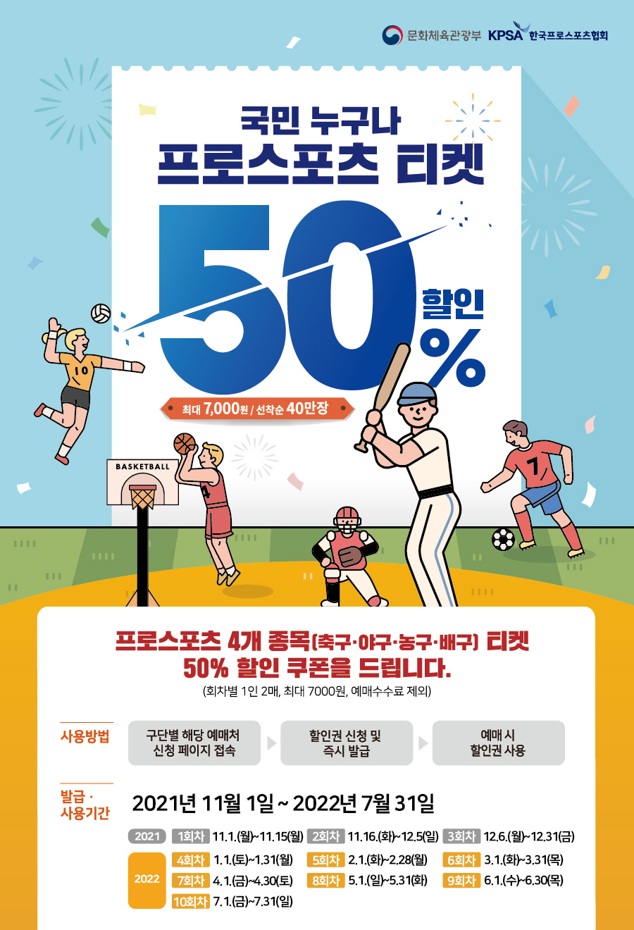 마지막으로 방역 패스 시행 중단 기간에는 실내외 스포츠 경기장에서 백신 접종 여부와 관계없이 전 좌석 관중 입장이 가능해. 그래서 이제 전 국민 스포츠 예매가 가능해졌는데 교봉이가 관련 꿀팁을 주자면, 한국프로스포츠협회에서 코로나로 위축된 스포츠 관람문화 활성화를 위해 KBO 리그를 포함한 프로스포츠 4개 종목(축구⚽, 야구⚾, 농구🏀, 배구🏐) 티켓 50% 할인 쿠폰💸을 지원하고 있어!