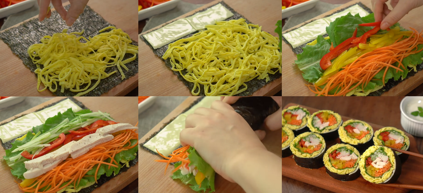 이제 본격적으로 김밥을 말아볼까~? 김밥용 김 위에 계란을 넓게 펴고 치즈를 반으로 갈라서 위에 올려줘. 치즈는 영양을 위해서 넣는 것도 있지만, 사실 나중에 김밥을 말 때 접착력에 엄청 도움이 된다는 꿀팁~!🤗 다음으로 계란 지단 위에 상추를 올리고 당근, 파프리카, 오이, 닭가슴살을 예쁘게 올려줘. 닭가슴살은 후추🧂를 살짝 뿌려줘도 좋아! 마지막으로 크래미를 올려주고 재료들을 감싸면서 잘 말아줘. 꿀꿀 눌러주면서 말면 안 터지고 밥 없는 예쁜 키토 김밥 완성! 정말 쉽고 간단하지~? 탄수화물인 밥이 안 들어갔는데 포만감도 좋고, 맛은 놀라울 정도로 더 좋으니 꼭 도전해 봐!