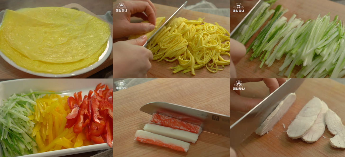 그럼 이제 키토제닉 식단 중 초보자도 30분 만에 쌀 수 있는 키토 김밥🍙 레시피를 알려줄게! 가장 먼저 계란🍳을 풀어서 지단을 만들어주고, 돌돌 말아서 얇게 썰어줘! 어차피 다 말아서 먹을 거니까 너무 예쁘지 않아도 돼~ 지단을 썰었으면 함께 들어갈 오이🥒와 파프리카, 당근🥕도 얇게 채 썰어줘. 마지막으로 크래미와 닭가슴살을 손가락 하나 크기로 잘라주면 재료 준비 끝!