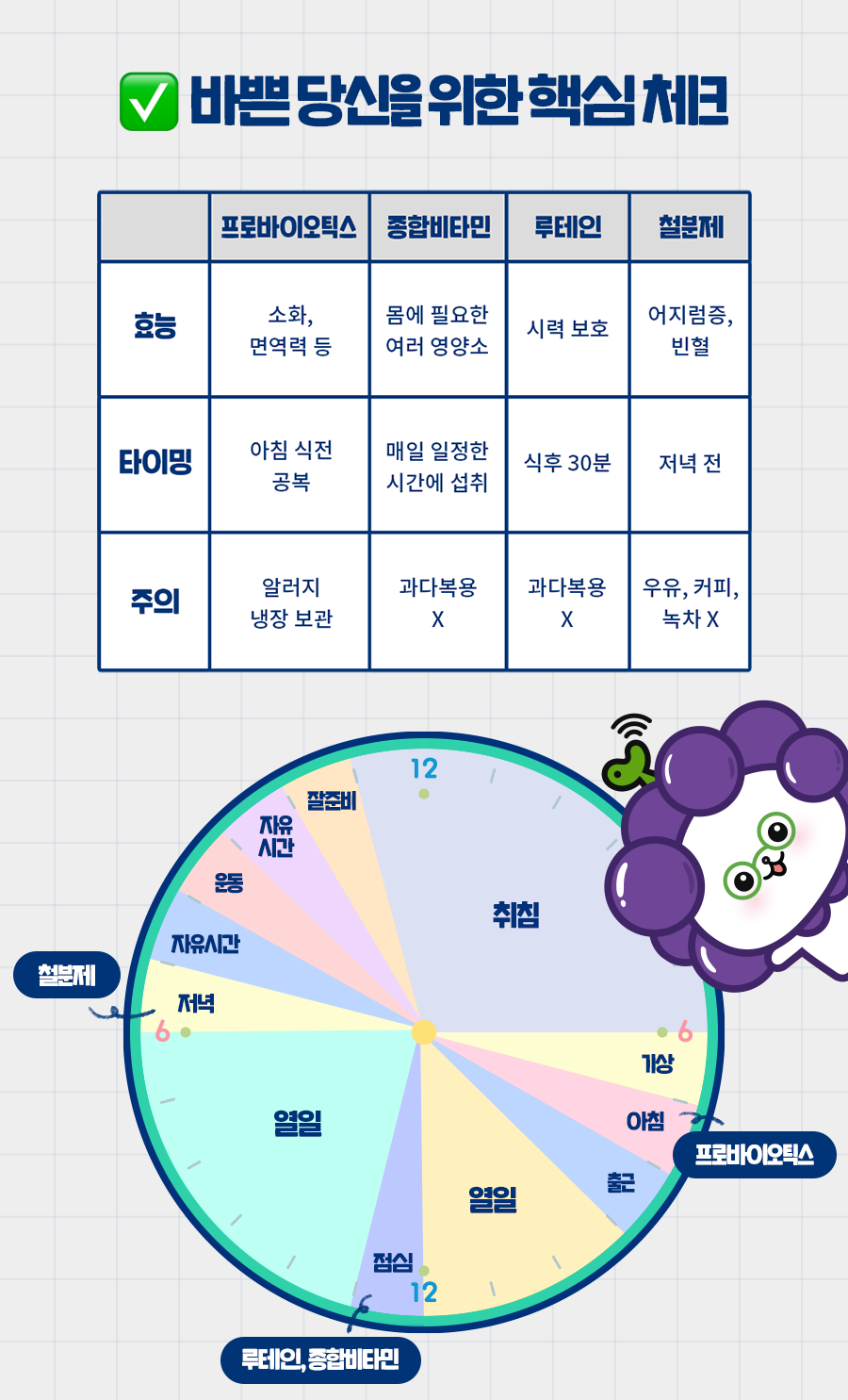 우리 몸에 필요한 비타민과 여러 영양소들이 총체적으로 들어있는 종합비타민은 어떨까? 비타민, 아연, 철 등 많은 종류의 성분이 알약 1알에 들어 있는 종합비타민은 식후에 먹어야 해.🍽 그래야 우리 몸에 음식물과 함께 더욱 흡수가 잘 되기 때문이지. 무엇보다 중요한 건! 규칙적으로 정해진 시간에 일정하게 먹는 거야.⏰ 보통 일하는 평일에는 제때에 밥을 먹지만 쉬는 날에는 기상 시간, 취침 시간이 유동적이라 밥 때도 제멋대로 바뀌지 않나..?😅 교봉이는 그래서 규칙적인 생활이 가장 어렵더라.. 친구들아 기억해줘! 종합비타민은 매일 정해진 시간에 규칙적으로 먹는 게 효과 보기 가장 좋다고 하니까, 잊지 말고 잘 챙겨서 먹어보자!