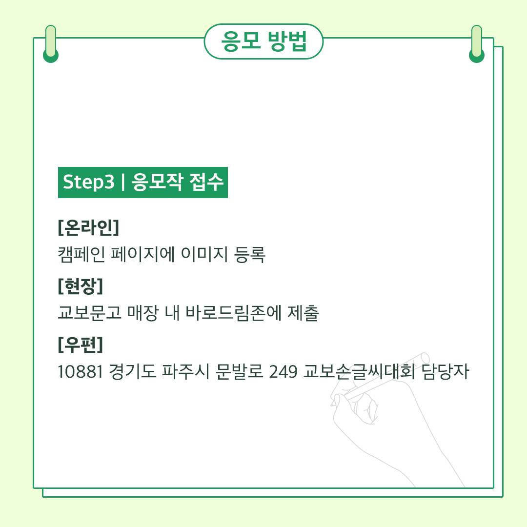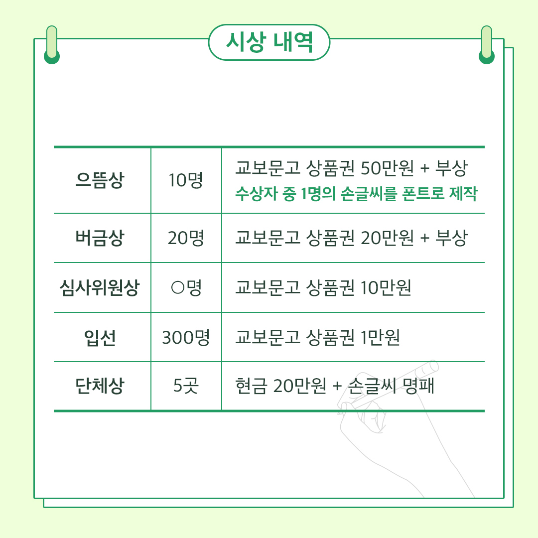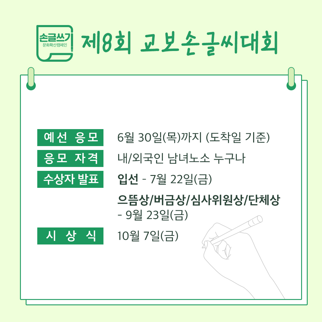 교-하! 감성과 지성이 메말라 가는 요즘, 🍃 교보생명에서는 디지털 소통의 부작용에 대한 해법으로 ‘손글쓰기’가 널리 확산될 수 있도록 ‘손글쓰기 문화확산 캠페인’을 진행 중이야. 그리고 이를 널리 알리기 위해서 <교보손글씨대회>도 개최하는데, 함께 더 자세히 알아볼까?