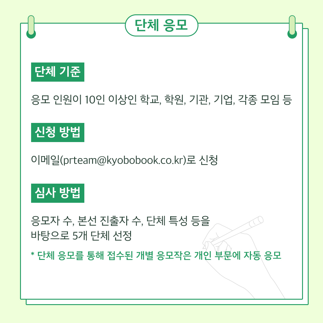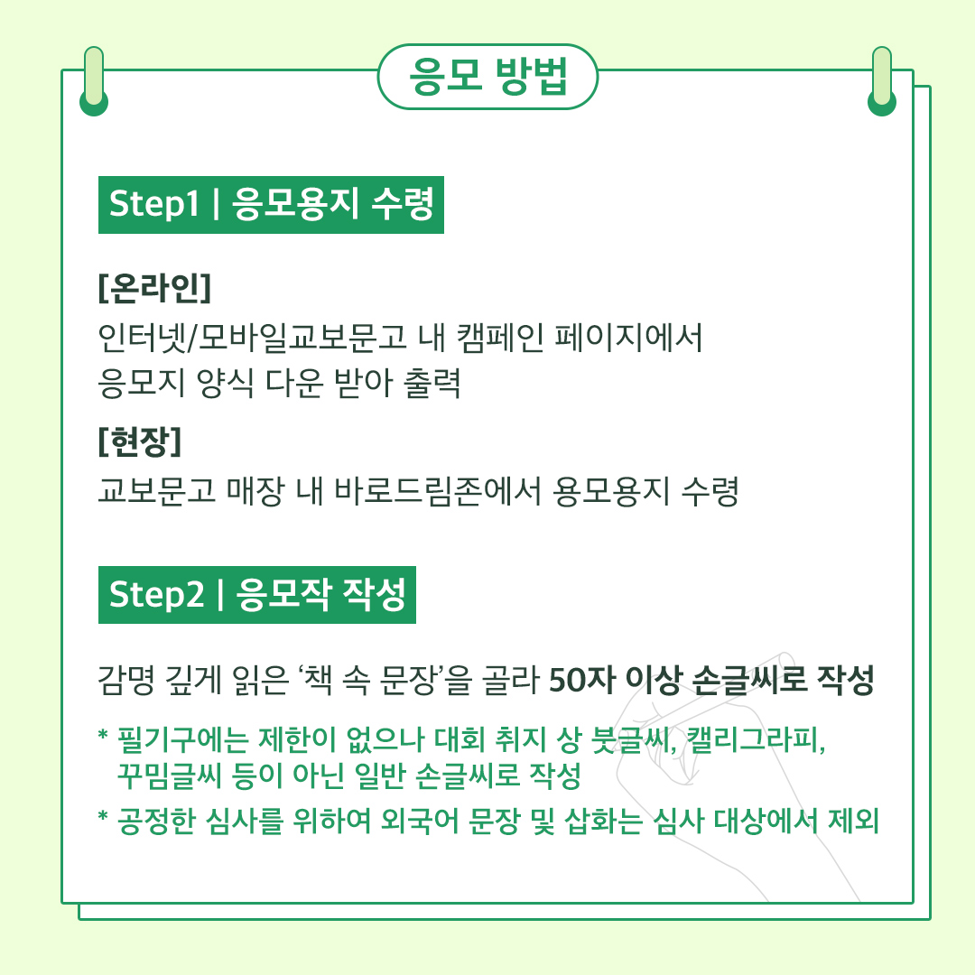 내 손글씨가 폰트로도 제작될 수 있다니! 정말 설레지? 간단히 응모할 수 있으니 아래 링크를 통해 모두 참여해보라구! 친구들의 마음을 움직였던 '책 속에서 감명받은 문장'을 자신만의 개성적인 손글씨로 적어줘! 참여 많이많이 부탁해! 그럼 교-바 💕