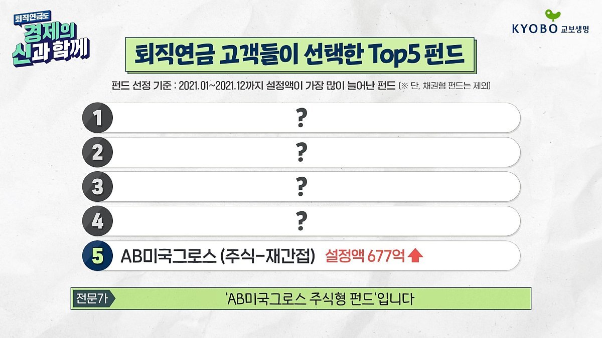 최시은 : 그럼 본격적으로 퇴직연금 고객들이 선택한 Top5 펀드 5위부터 살펴보도록 하겠습니다. 어떤 펀드일까요.