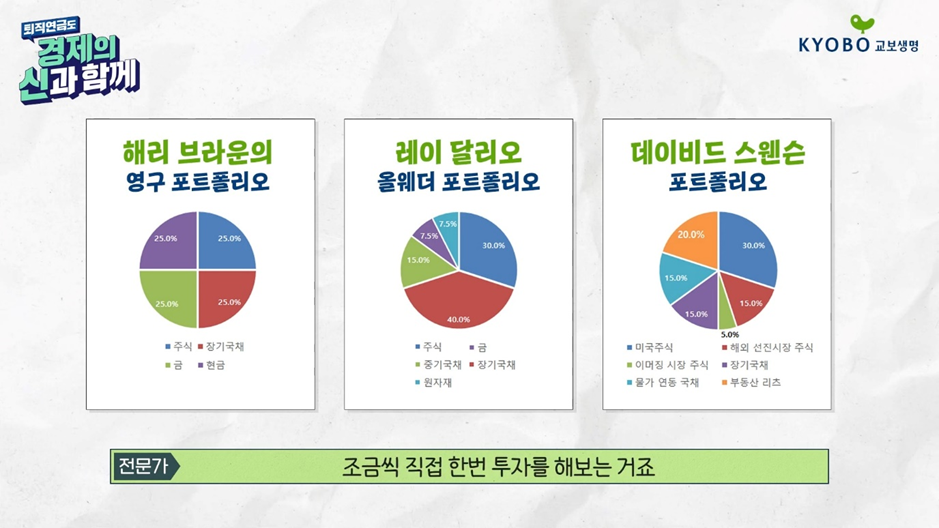 김종진 : 자산 배분이라고 해서 어렵게 다가가시면 계속 못 하시게 되거든요. 전통적인 해리 브라운의 포트폴리오도 있고요 데이비드 스윈슨의 포트폴리오까지 널리 알려진 자산 배분의 방식대로 조금씩 직접 한번 투자를 해보는 거죠.