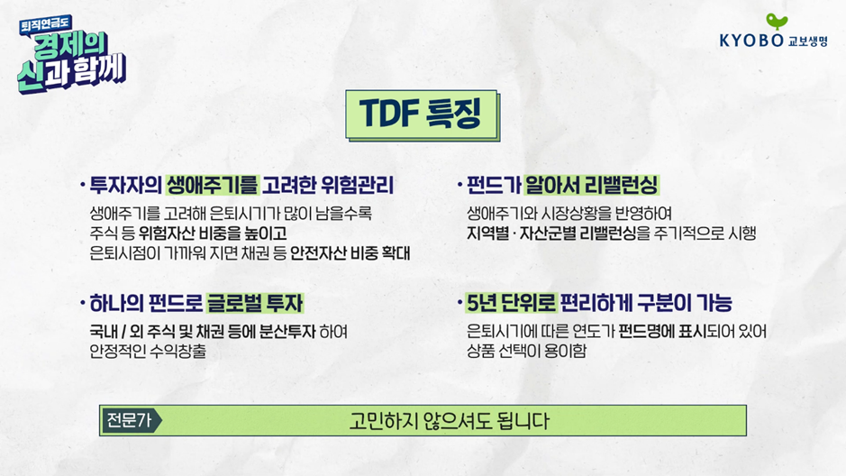 마지막으로, ‘나는 정말 모든 것을 알아서 해줬으면 좋겠다’라는 친구들에게 좋은 방법일 것 같은데, TDF 상품에 투자해 보는 것이야! TDF는 실제 인생 은퇴 연령에 맞춰서 주식의 비중을 조절해 주는 상품이야. 펀드가 알아서 해외 국내 자산에 배분하고 리밸런싱까지도 하기 때문에 자산 배분 상품 선택, 상품 변경까지도 고민할 필요가 없다는 장점이 있어!