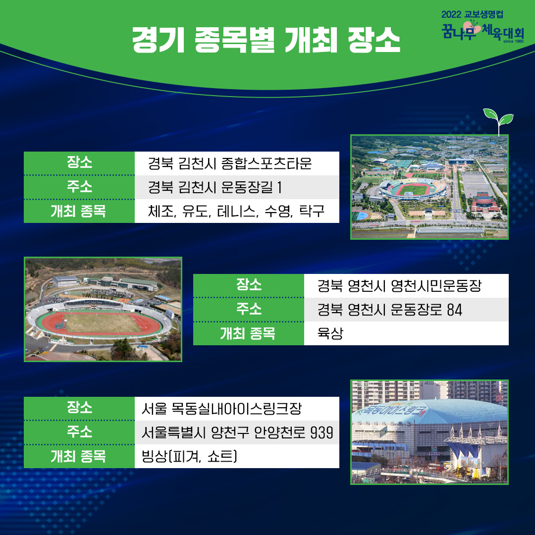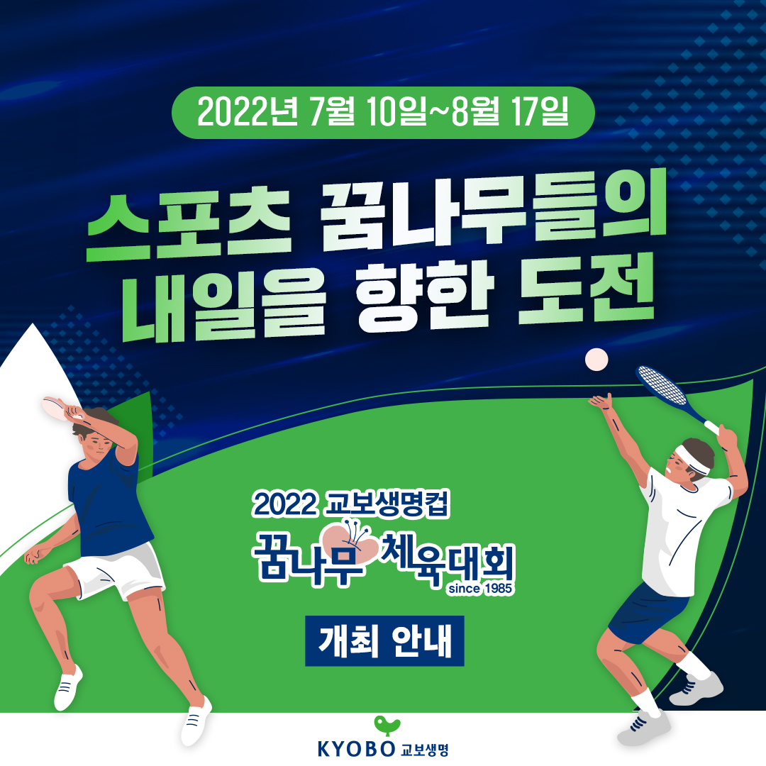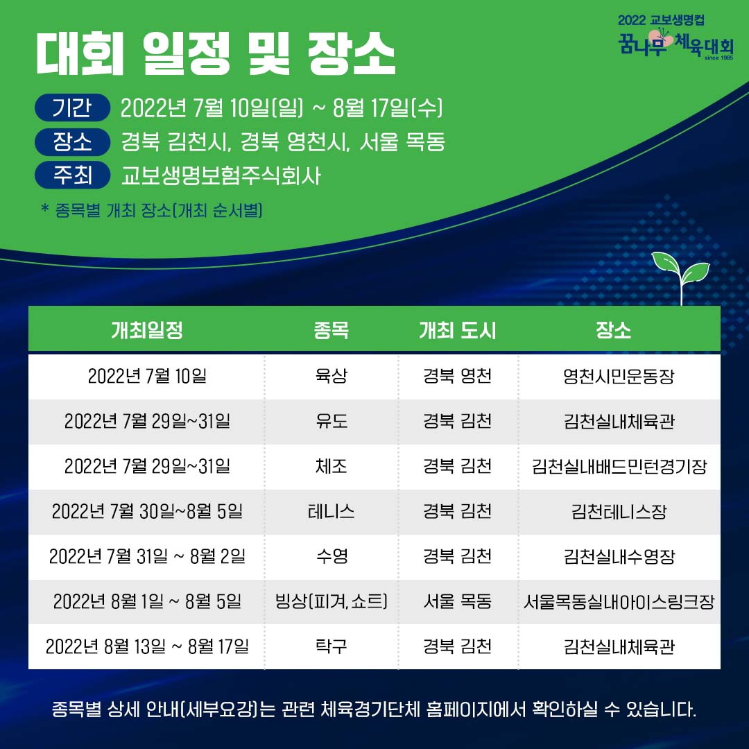 특히 이번 꿈나무체육대회는 코로나 때문에 진행되지 않다가, 마지막 대회 이후 3년만에 열리게 됐는데, 지난 7월 10일 육상 경기를 시작으로 8월 17일까지 경북 지역과 서울에서 종목별로 일정이 진행돼! 🎇 민간기업에서 진행되기 때문에 종목 수가 별로 없겠다고 생각하는 친구들도 있겠지만, 꿈나무체육대회는 ‘국민교육진흥'이라는 교보생명 창립이념에 따라 육상, 수영, 체조, 테니스, 빙상, 탁구, 유도 총 7개의 기초체육 종목을 개최해. 대회 참가 기회가 부족한 기초체육 종목 유소년 선수들에게 아주 좋은 기회가 되겠지? 🏆 흥미진진한 경기가 많이 열리고 있으니까 관심 있는 친구들은 종목별 일정을 참고해줘. 😉