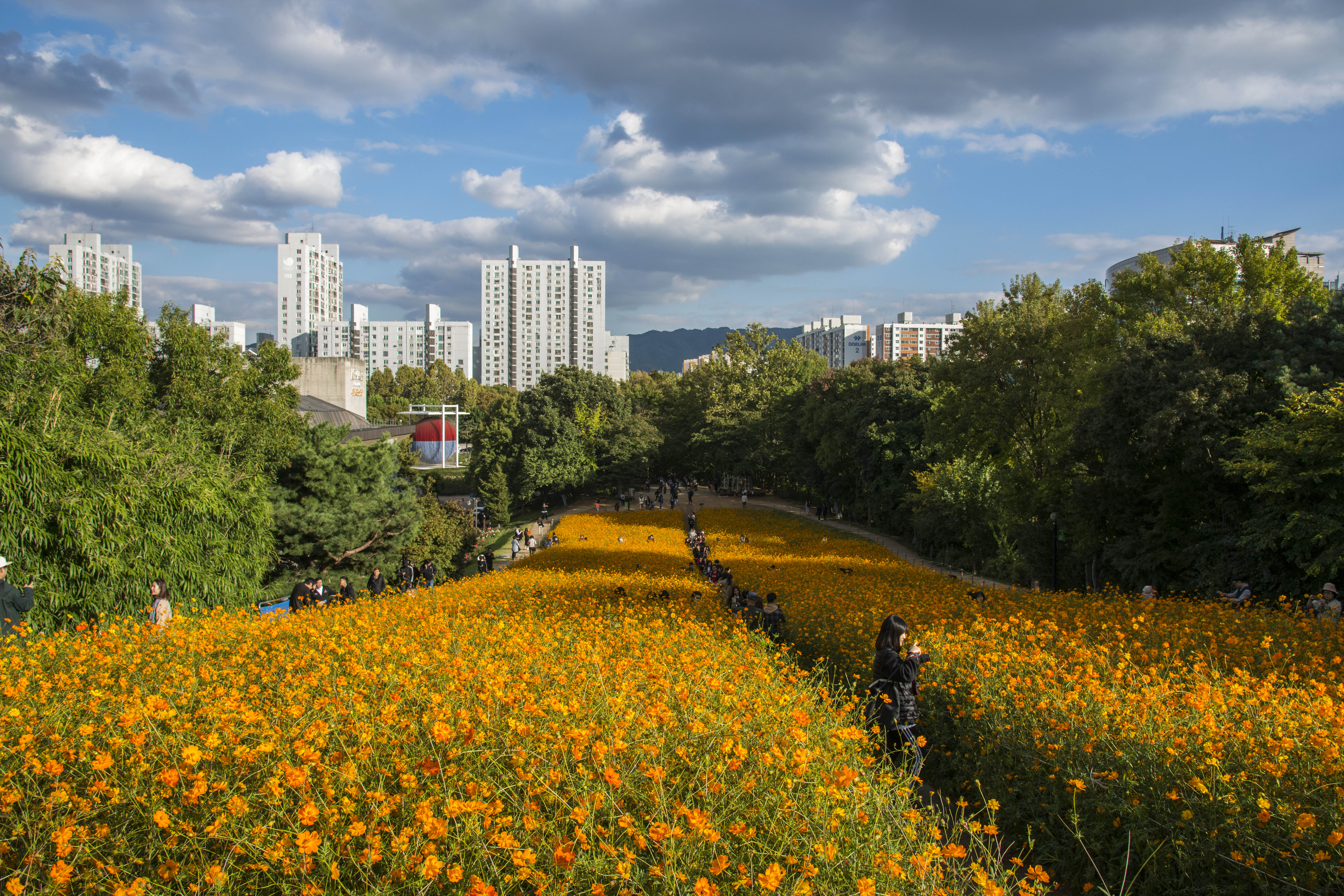 가장 먼저, 서울에서 황화 코스모스🏵를 즐기고 싶은 친구들을 위해 올림픽공원 들꽃마루를 추천해. 정열의 멕시코가 원산지인 황화 코스모스는 보통 알고 있는 분홍 코스모스보다 더 열정적인 느낌의 주황색 꽃이 특징이야. 꽃말도 ‘넘치는 야성미’라는 의미를 갖고 있지.
