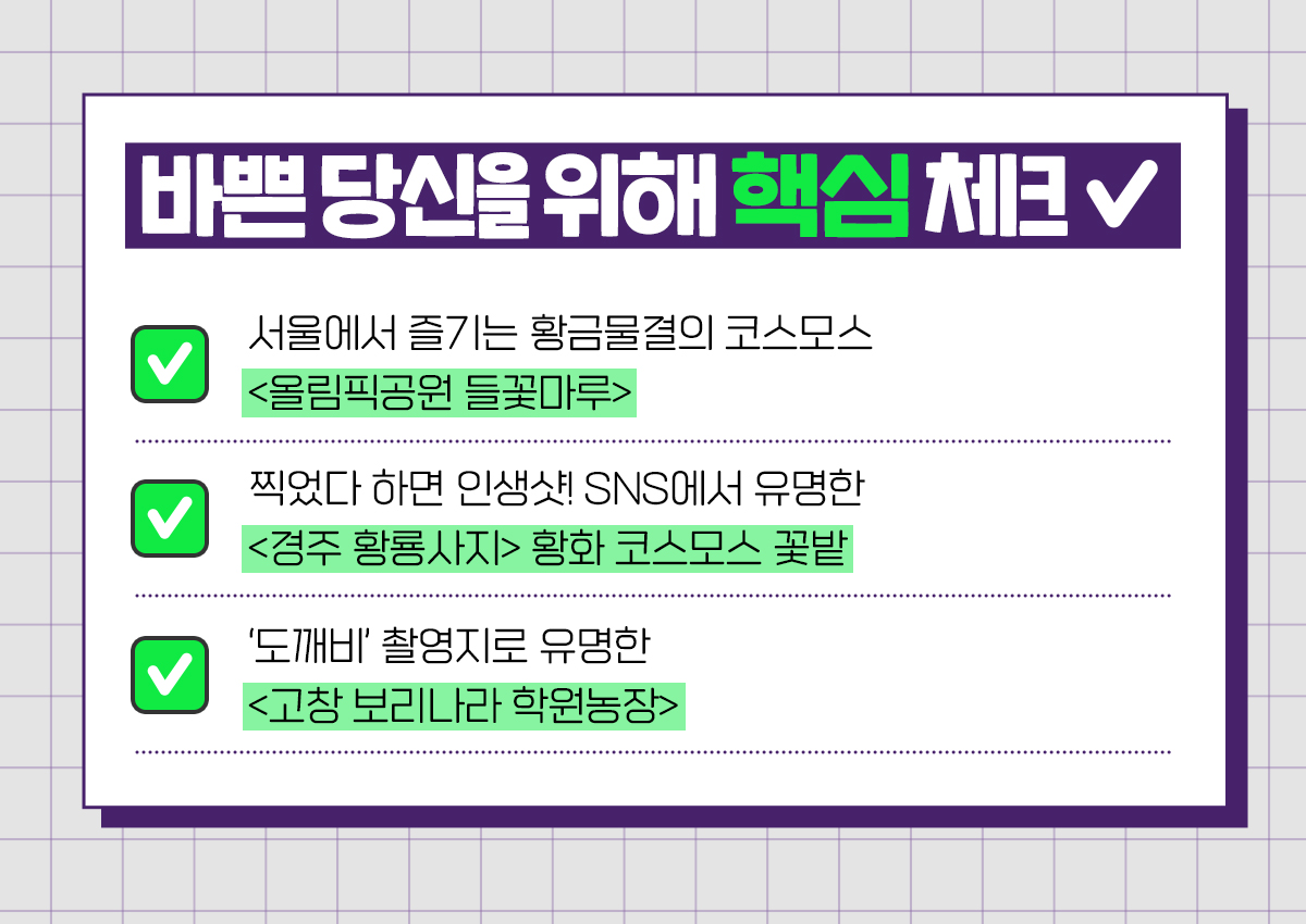 교-하! 친구들 안녕?👋🏼 무더웠던 여름이 지나가고, 이제 정말 한낮에도 선선한 바람이 부는 가을이 성큼 다가왔어! 일 년 중 며칠 되지 않는 가을 날씨는 꽉 잡아야 하는 거, 친구들도 모두 알고 있지~!? 머뭇거리면 지나가버리는 가을 날씨를 멋진 풍경과 만끽하기 위해, 오늘은 교봉이가 황화 코스모스가 가득한 장소를 알려줄게. 눈 앞에 펼쳐지는 금빛 절경을 보며 힐링하고, 인생샷📷도 건져봐!