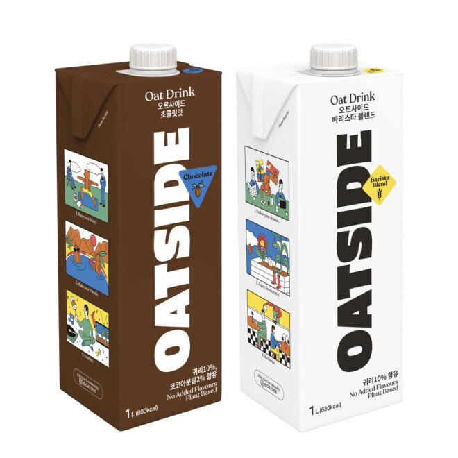 우리에게 조금 익숙한 식물성 대체우유 기업은 오틀리(OATLY)일거야. 오틀리에서 귀리로 만든 오트밀크는 쌀의 구수함이 느껴져서 특별한 거부감 없이 도전해볼 수 있다고 해.😌 그리고 올해 3월엔 귀리음료 브랜드인 오트사이드(OATSIDE)가 국내에 출시되기도 했어! 주목할 점이 있다면, 귀리를 찌지 않고 통째로 로스팅해서 풍부한 향이 느껴지고 크리미한 질감을 경험할 수 있다는 거야.👍🏼 바리스타 블렌드와 초콜릿맛 2종류로 출시되었다고 하니 귀리음료가 궁금한 친구들은 한 번 도전해봐도 좋겠다! 물론 콩으로 만든 두유 보다 더 개성 있는 맛을 느낄 수 있다는 완두콩 두유, 스프라우드 오리지널도 추천할게!💚